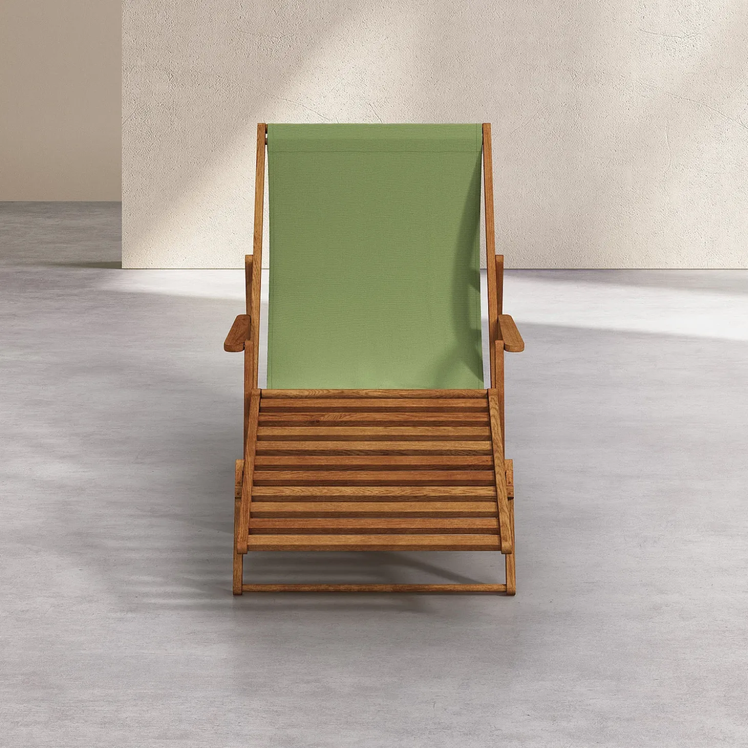 La chilienne Maui avec accoudoirs et repose-pieds associe chêne massif huilé et toile en coton vert olive dans un esprit léger et nomade.