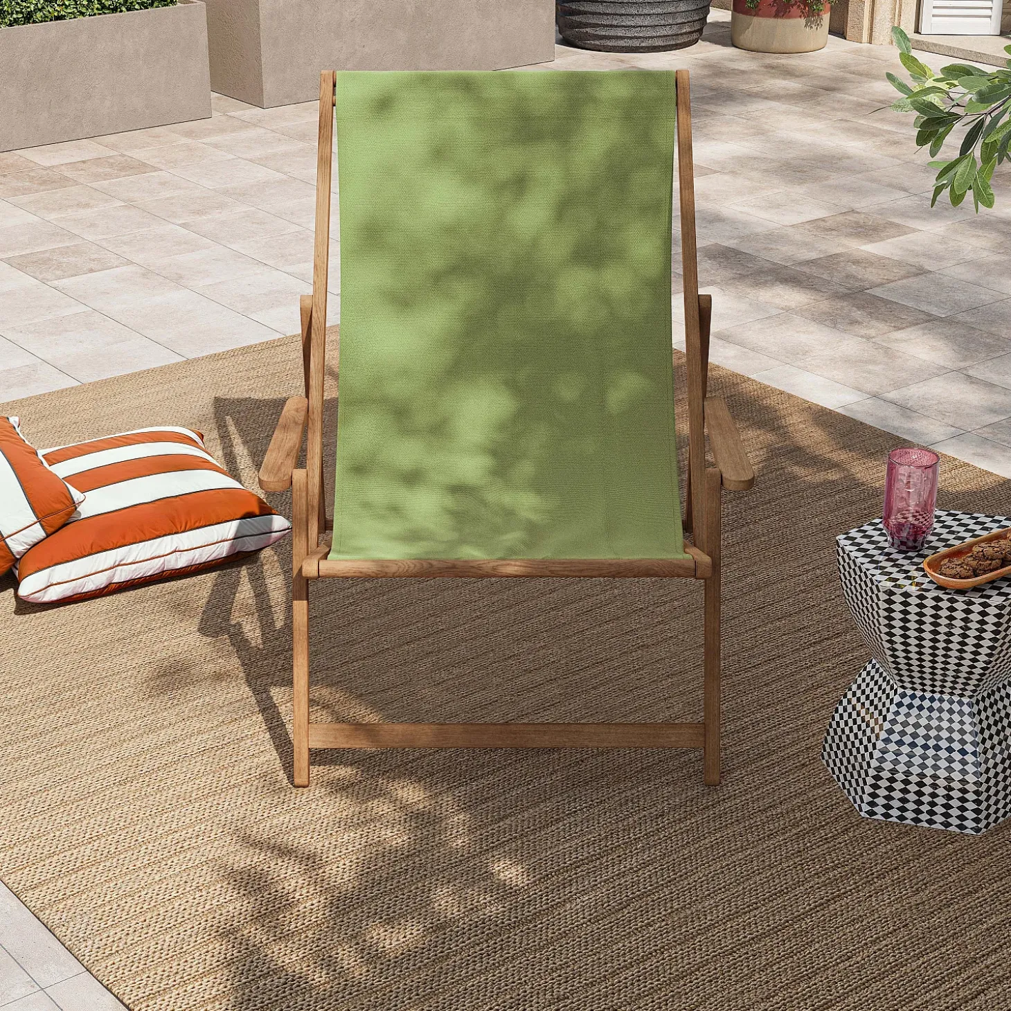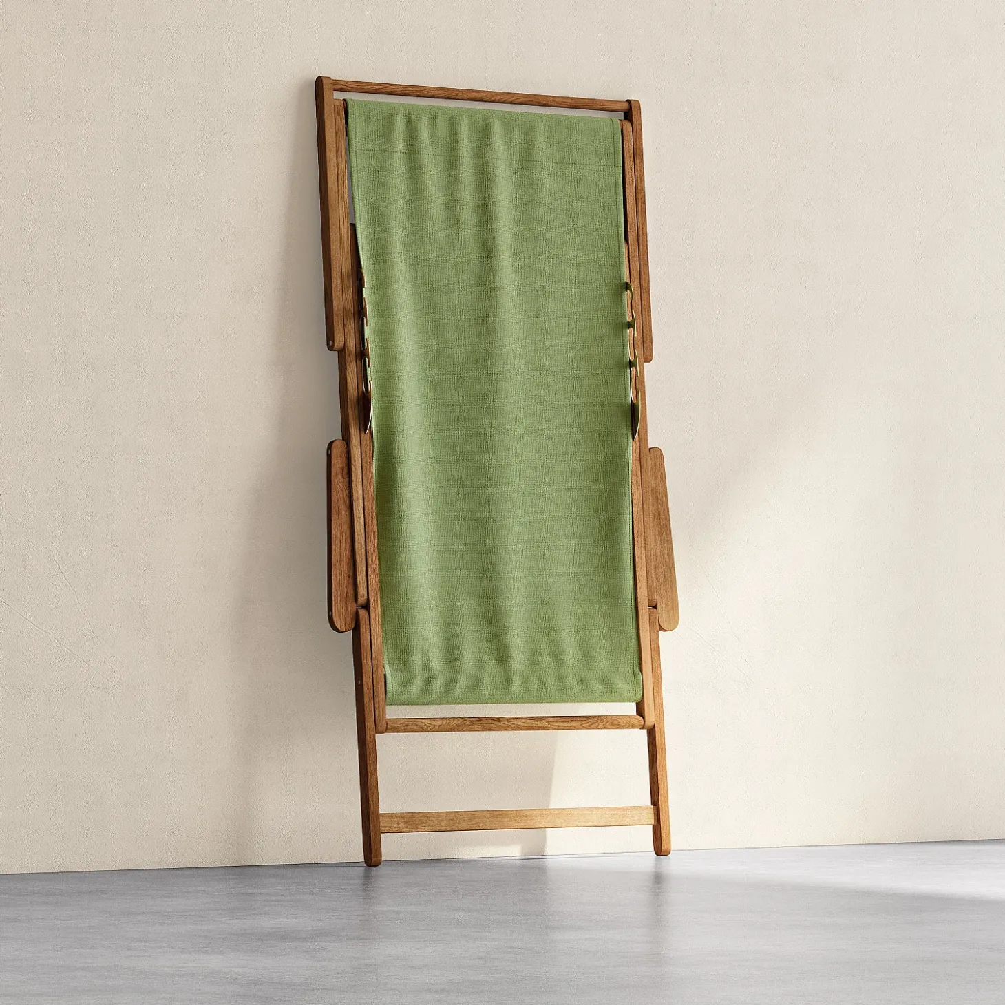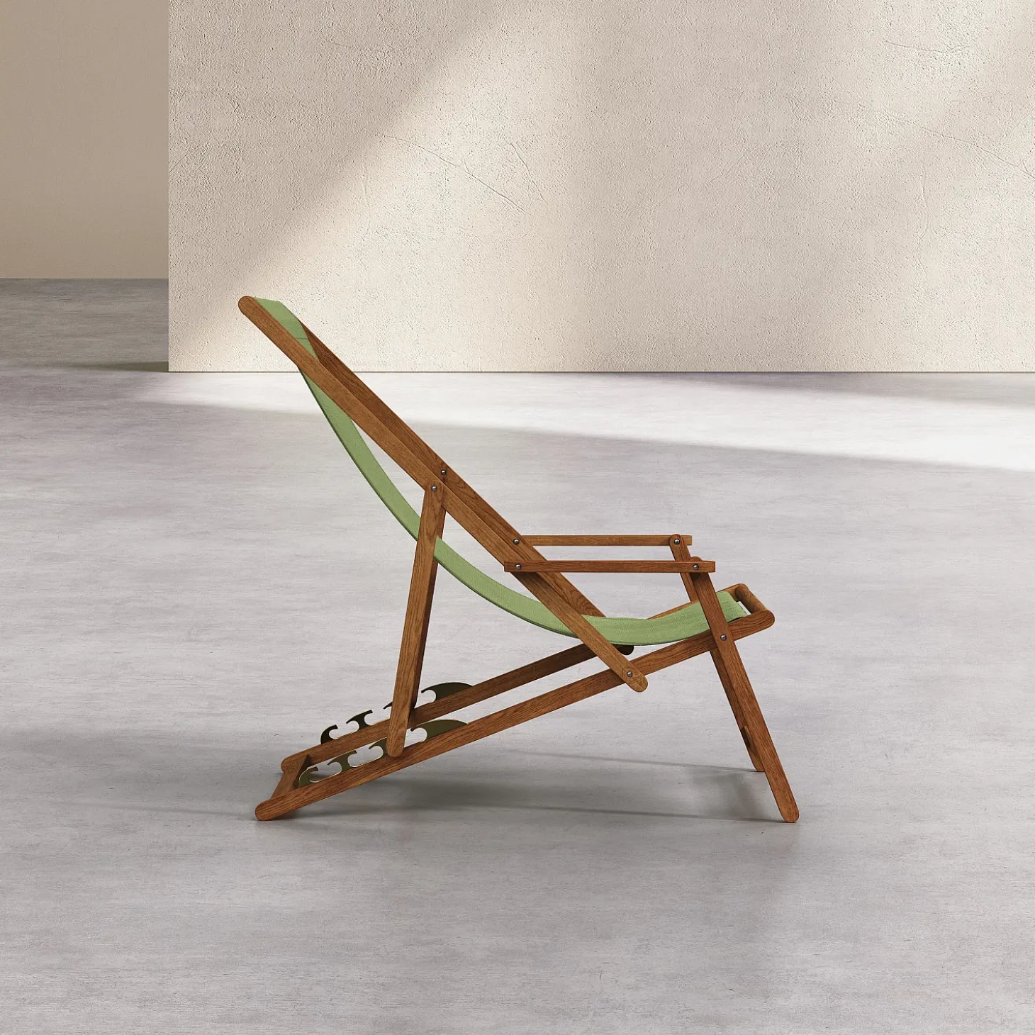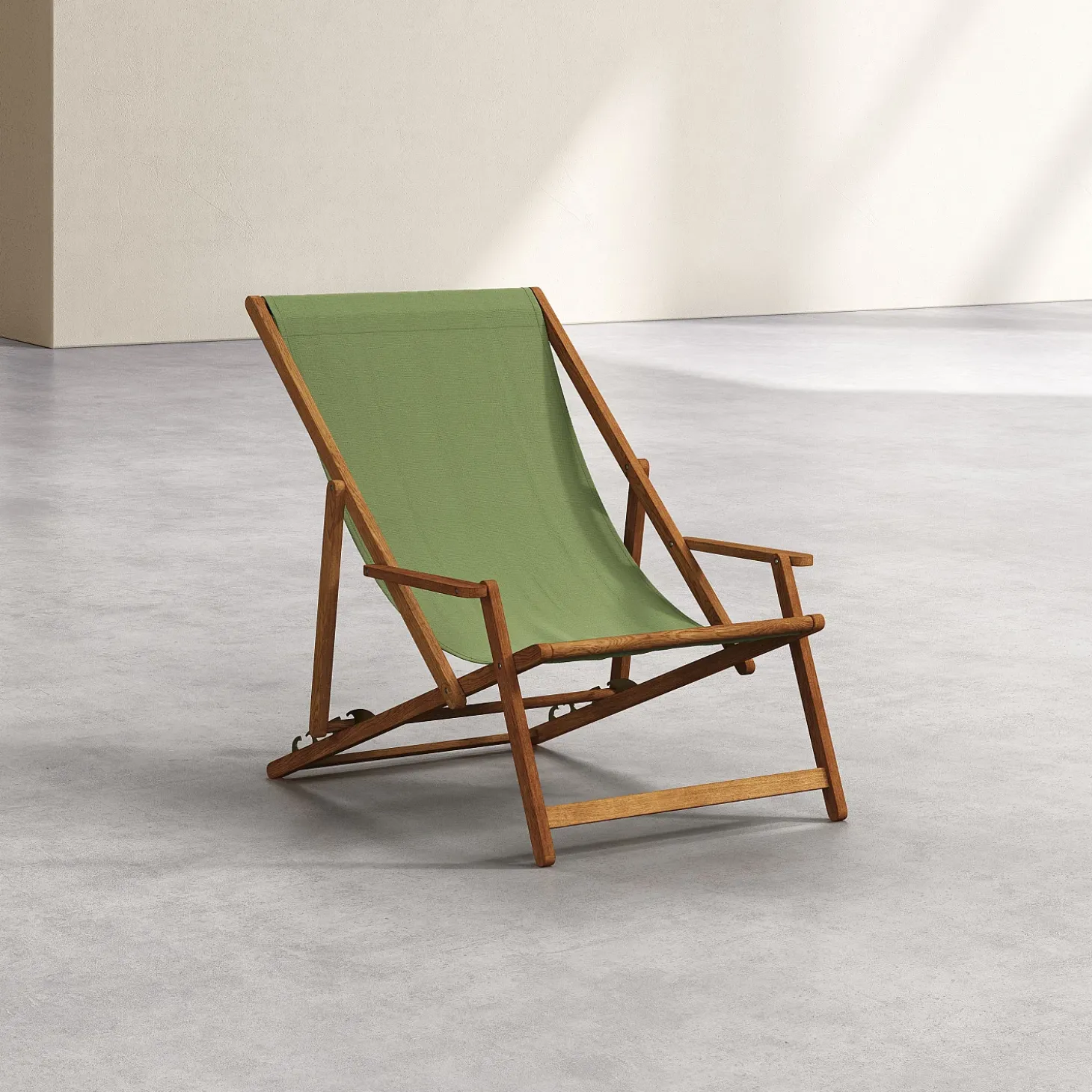 La chilienne Maui avec accoudoirs combine chêne massif huilé et toile en coton vert olive dans un design léger et fonctionnel.