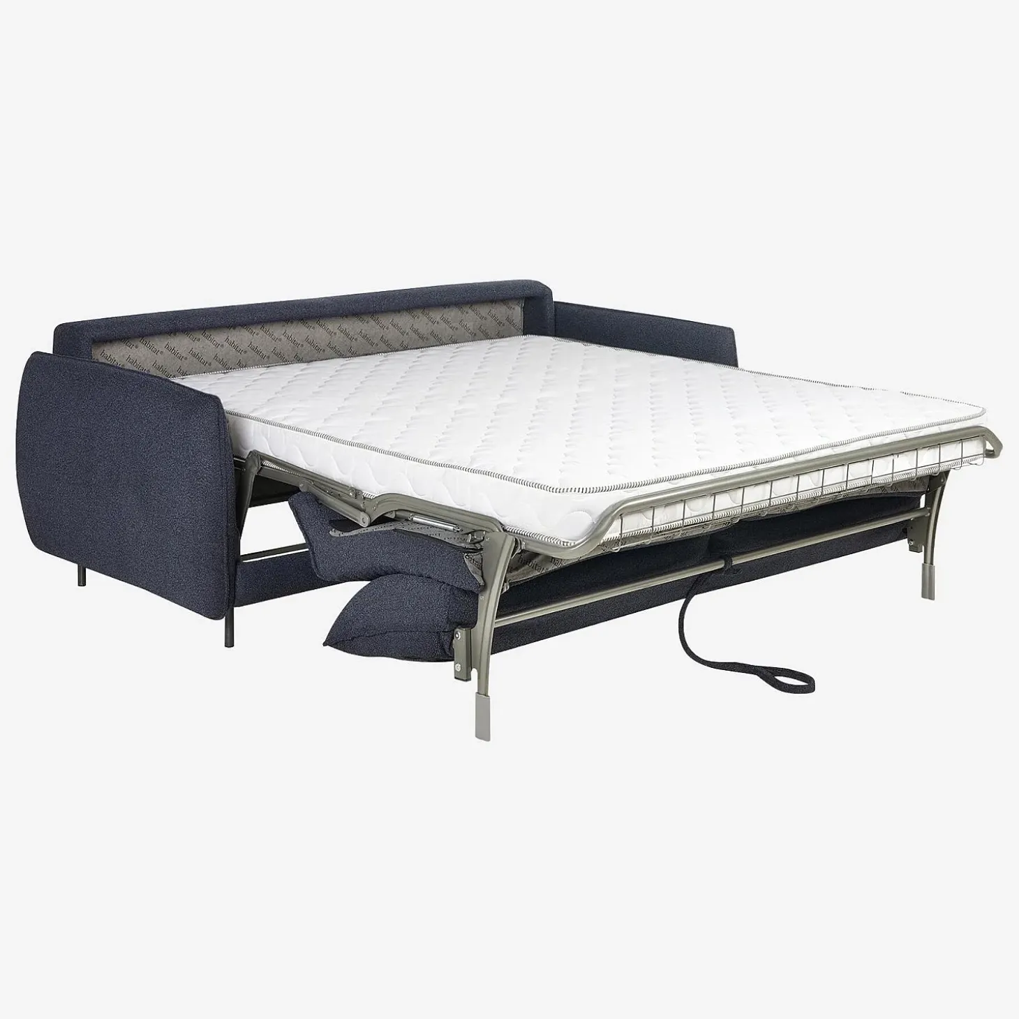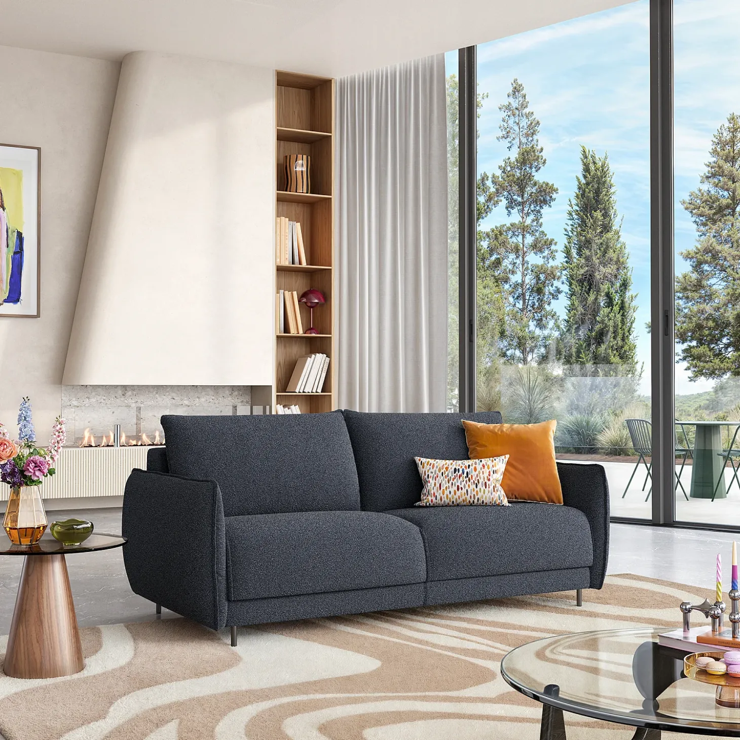 Le canapé convertible 2 places Milano est habillé d’un tissu Tolfa en bouclette courte, au coloris bleu marine profond et apaisant. Ce canapé-lit offre un couchage de 140 x 190 cm avec un matelas en mousse de 14 cm d’épaisseur. Conçu pour un sommeil réparateur, il est digne d’un véritable lit. Afin de sublimer chaque intérieur et garantir des nuits de qualité, le canapé convertible Milano est personnalisable. Le choix du coloris, revêtement, taille du couchage, épaisseur du matelas et type de sommier vous revient, s’adaptant ainsi à tous les besoins.