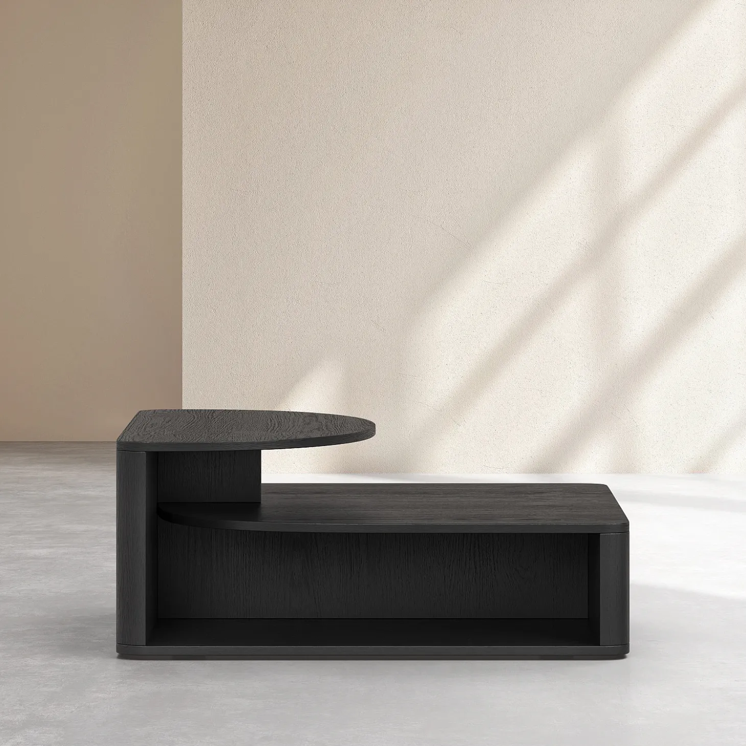 La table basse Milord propose une silhouette contemporaine qui attire le regard grâce à sa forme asymétrique singulière. Le contraste des courbes douces et des lignes droites crée un équilibre graphique subtil, accentué par la teinte profonde du frêne noir.