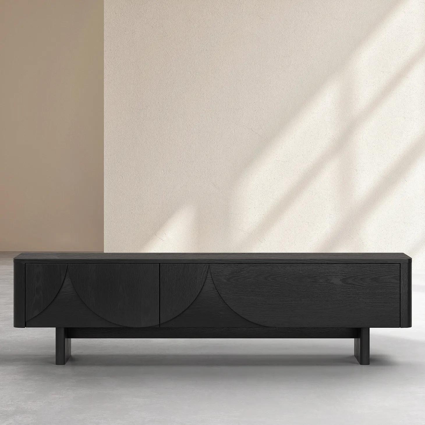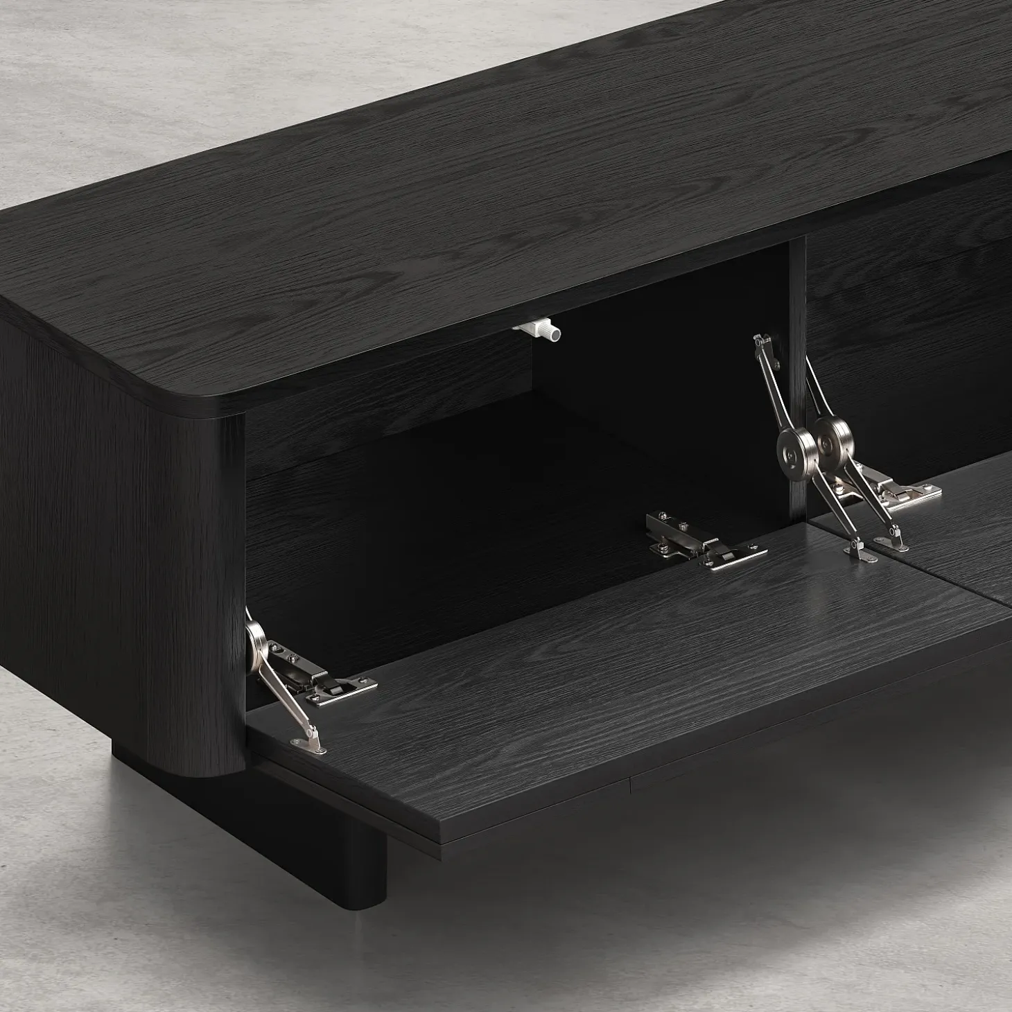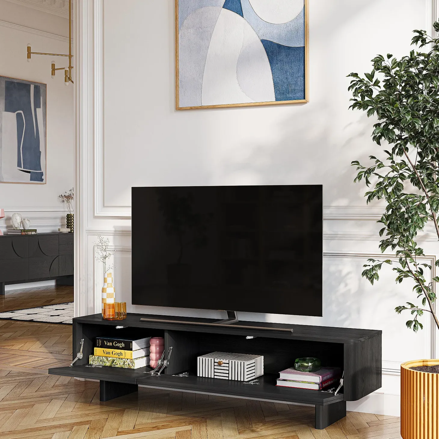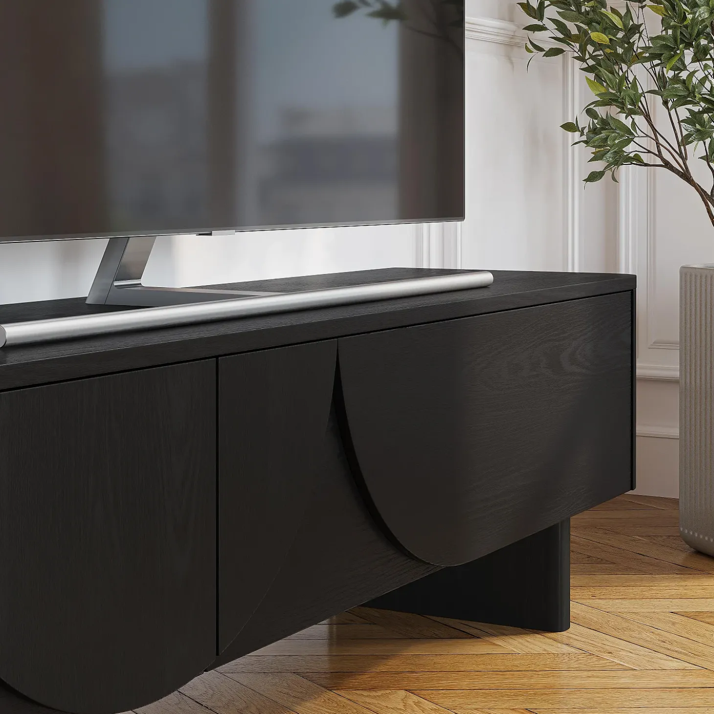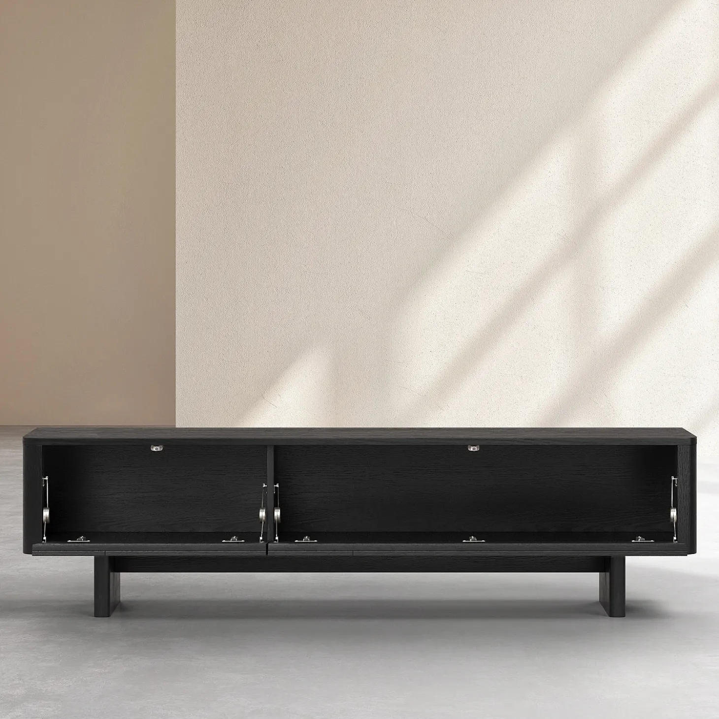 Le meuble TV Milord en frêne noir s’ouvre grâce à deux abattants dotés d’un système à compas, dissimulant un grand volume de rangement, idéal pour les équipements multimédia. Sa ligne basse allège visuellement l’espace et permet de structurer le salon avec justesse.
