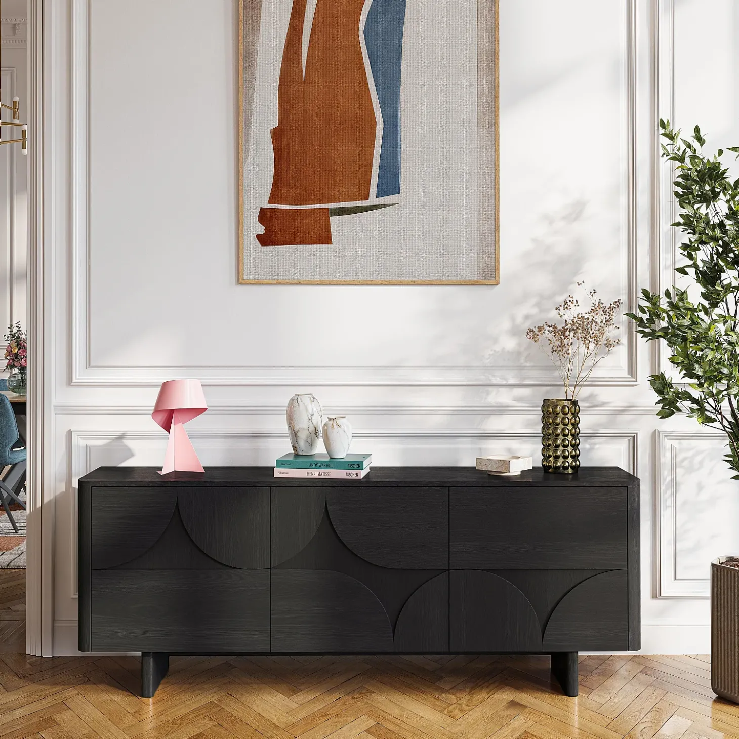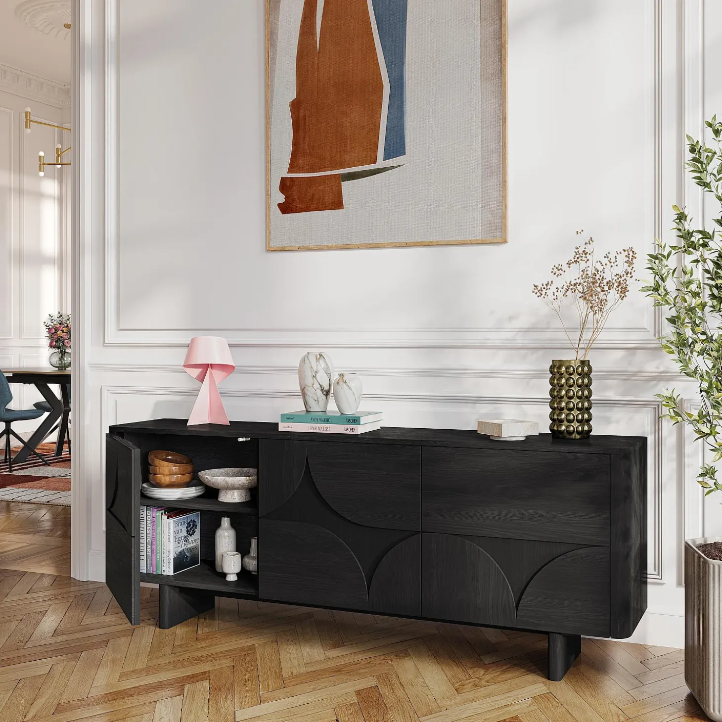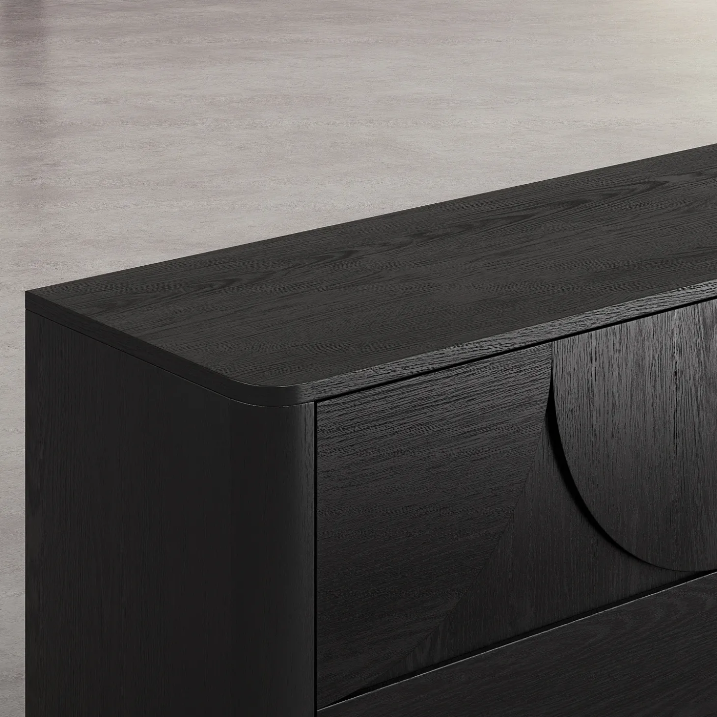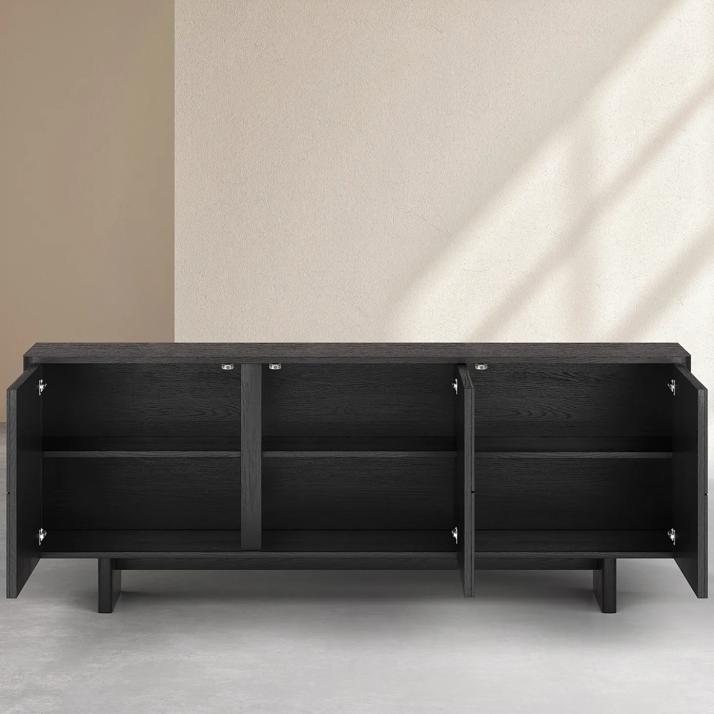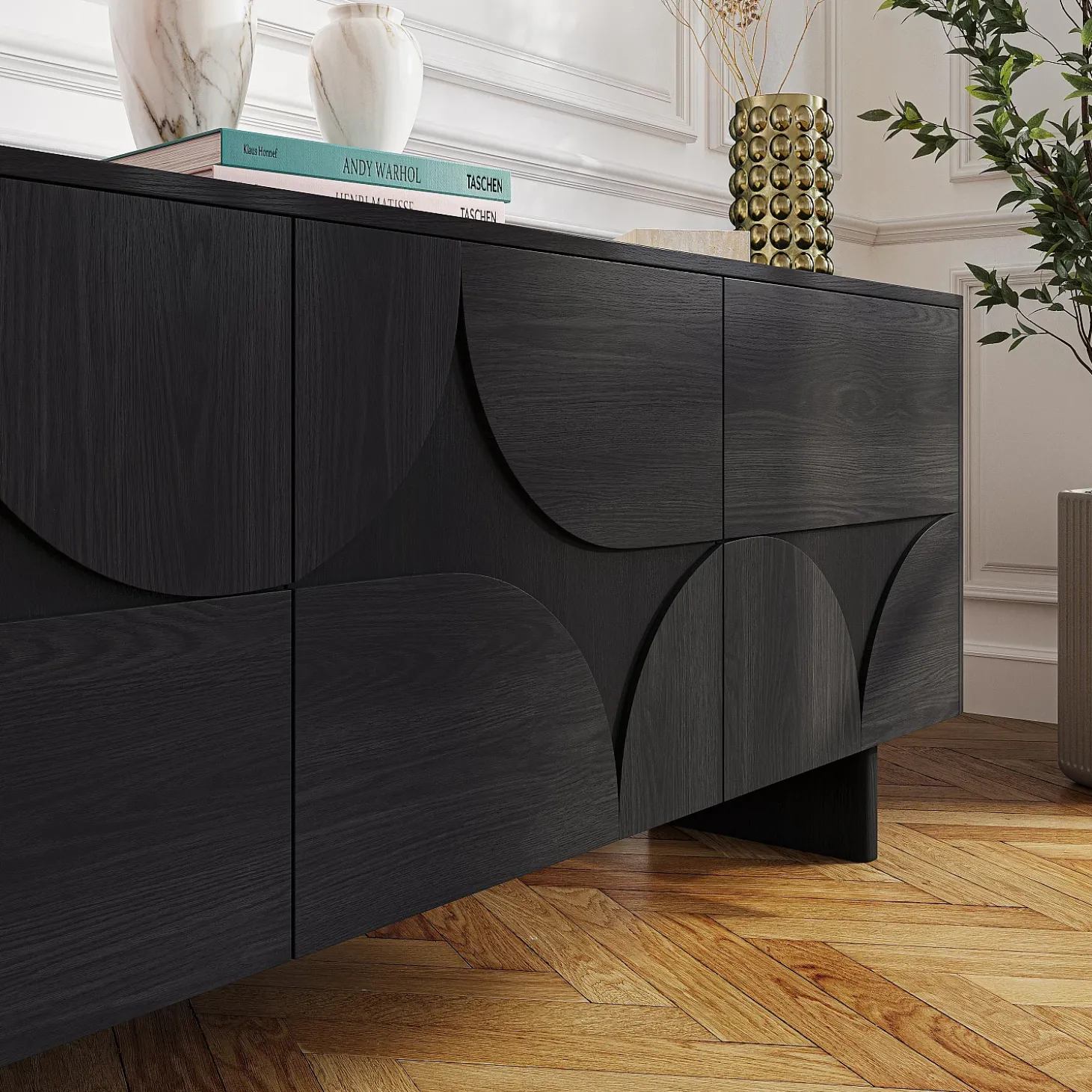 Avec ses trois portes sculptées, le buffet bas Milord en frêne noir offre une capacité de rangement généreuse tout en structurant l’espace avec légèreté grâce à sa silhouette allongée. Ses portes au système push to open assurent une façade continue, sans poignée visible.