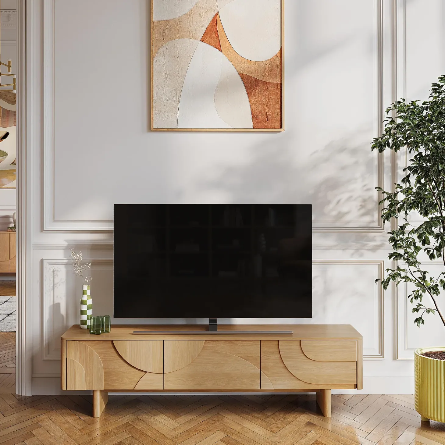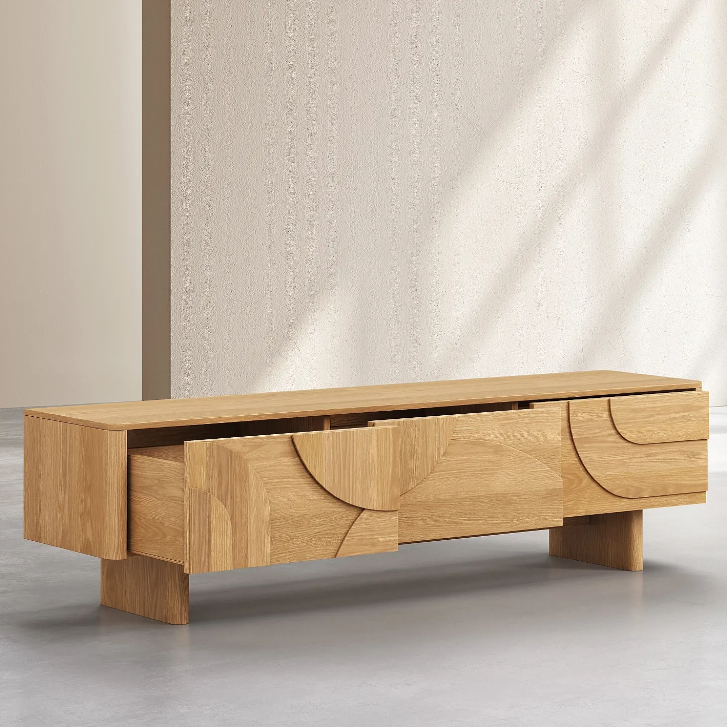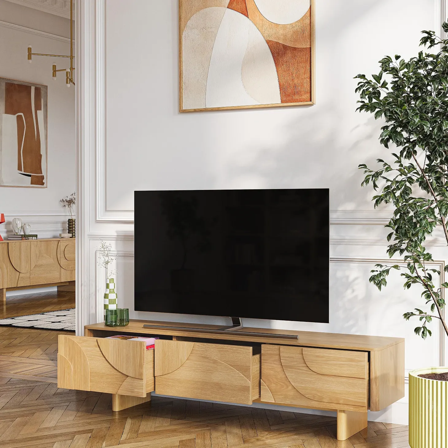 Le meuble TV Milord en chêne clair est doté de trois tiroirs parfaits pour camoufler les équipements multimédia. Sa ligne basse allège visuellement l’espace et permet de structurer le salon avec justesse.
