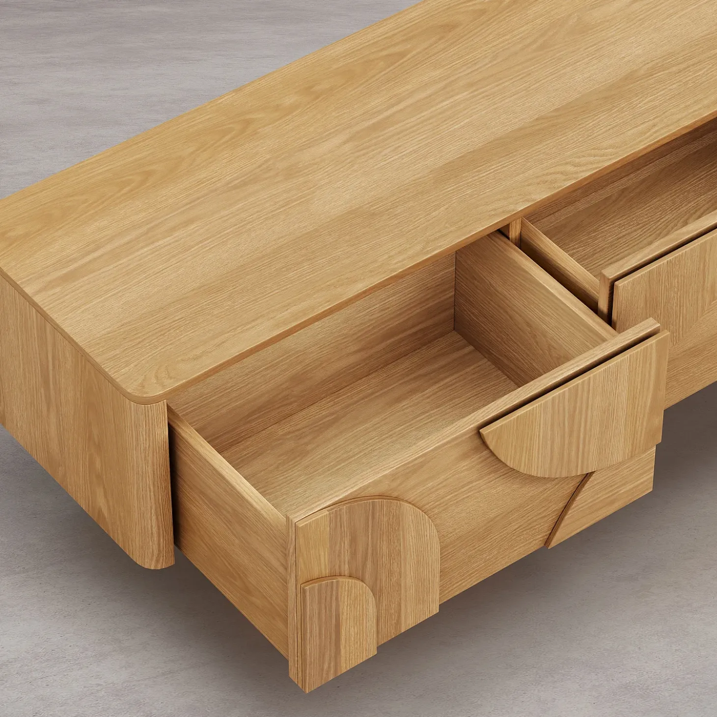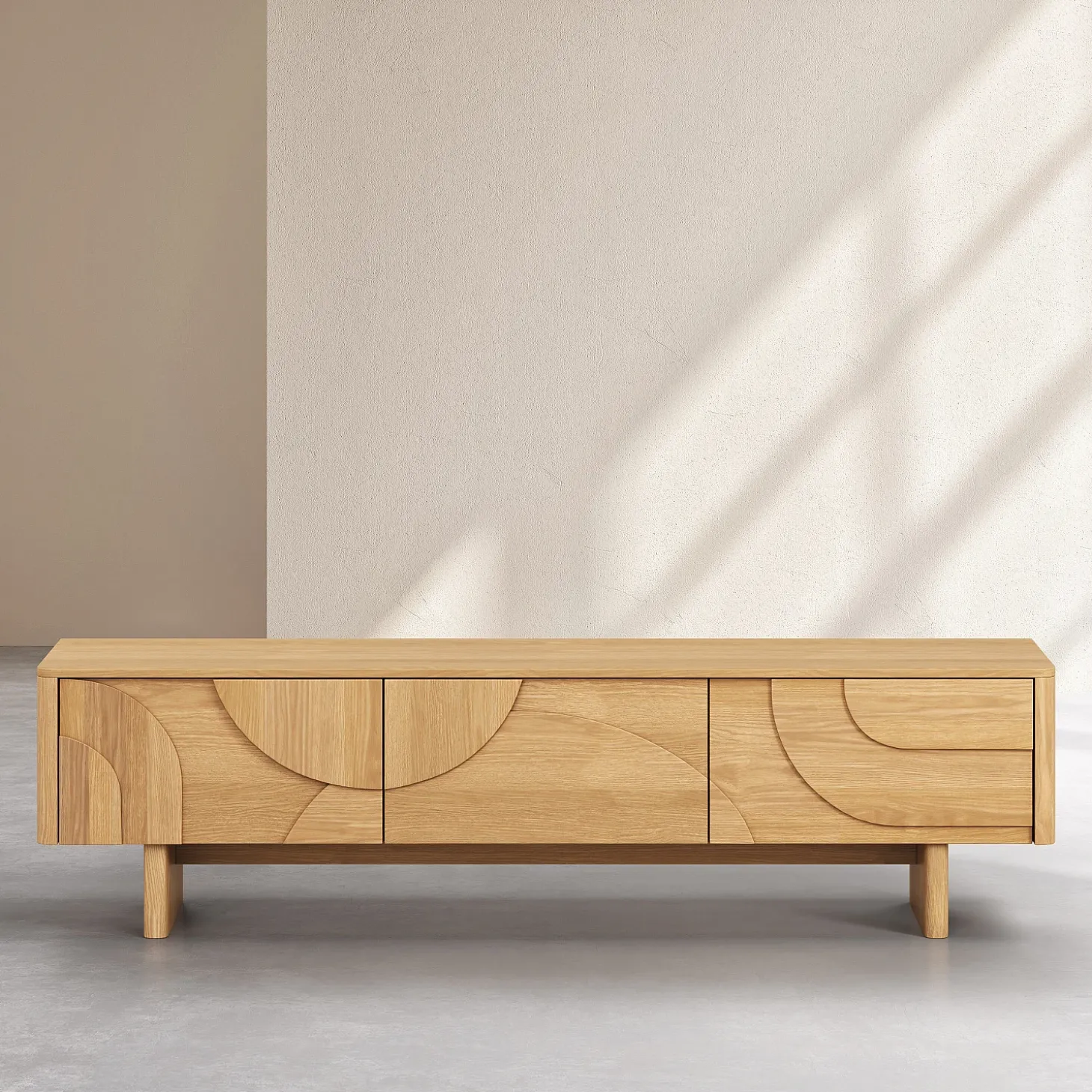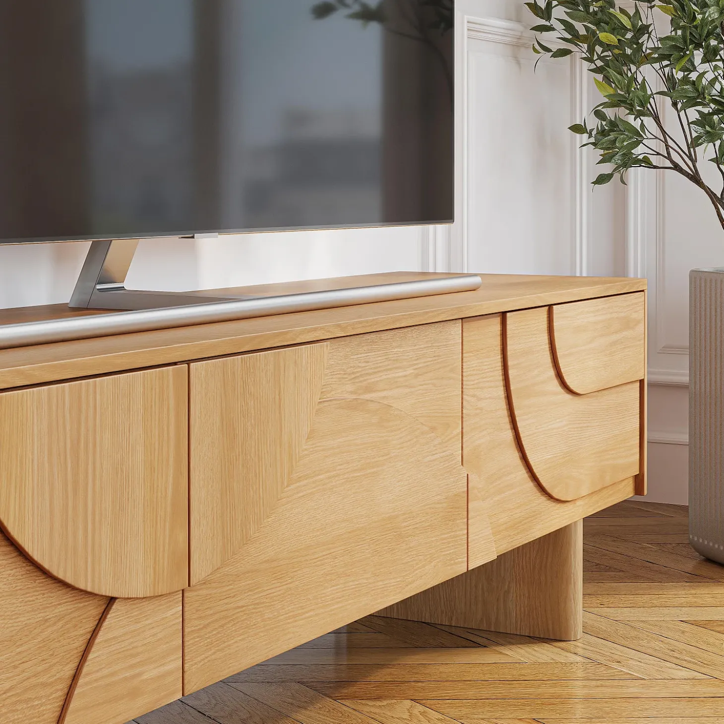 Le meuble TV Milord en chêne clair est doté de trois tiroirs parfaits pour camoufler les équipements multimédia. Sa ligne basse allège visuellement l’espace et permet de structurer le salon avec justesse.