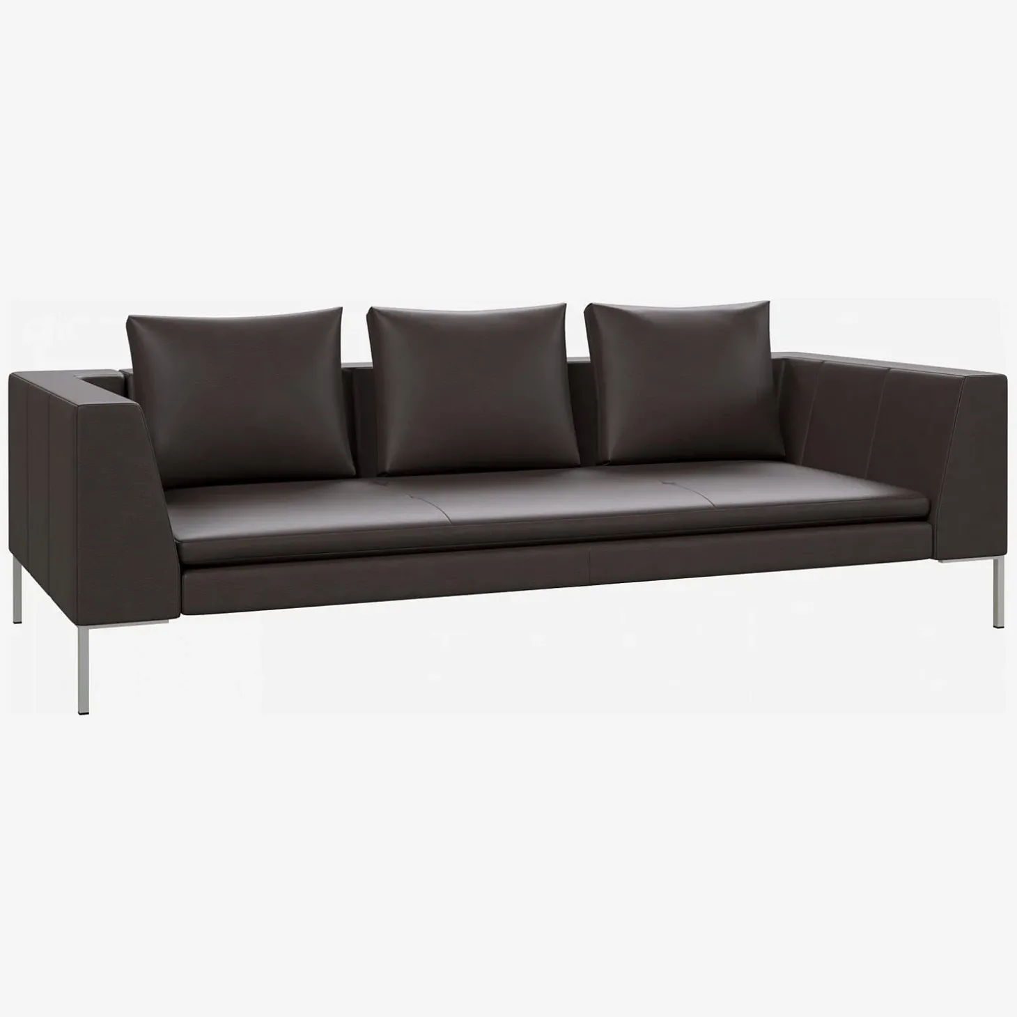 Charge maximale supportée : 390 kgAssise rectiligne, cuir lisse et piètement fin composent un canapé 3 places au style élégant et minimaliste. Une pièce intemporelle qui structure le salon avec légèreté et distinction.