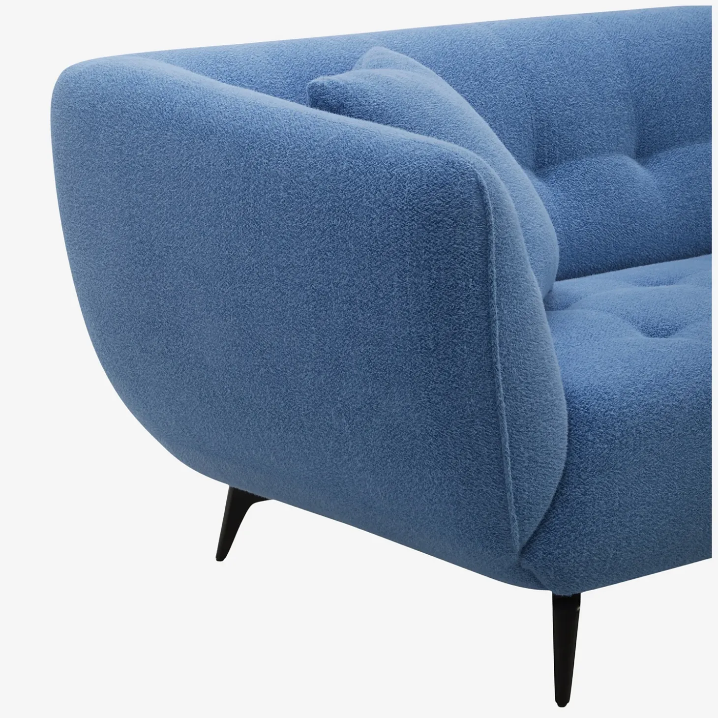 Sa structure incurvée repose sur des pieds fins en métal noir qui allègent visuellement l’ensemble tout en lui conférant une stabilité discrète. Revêtu d’un tissu texturé bleu vif, cette création propose un contraste dynamique entre forme douce et caractère affirmé.