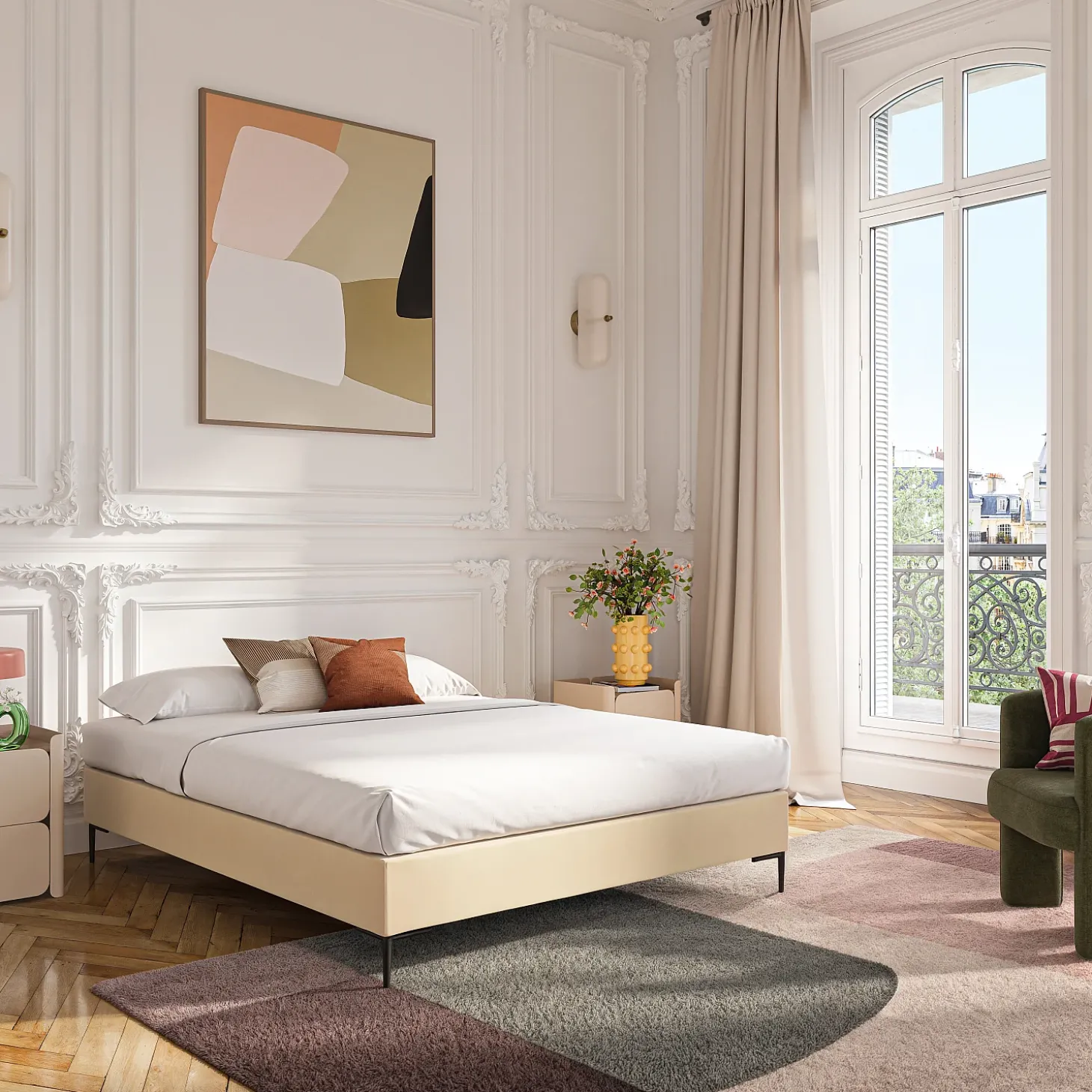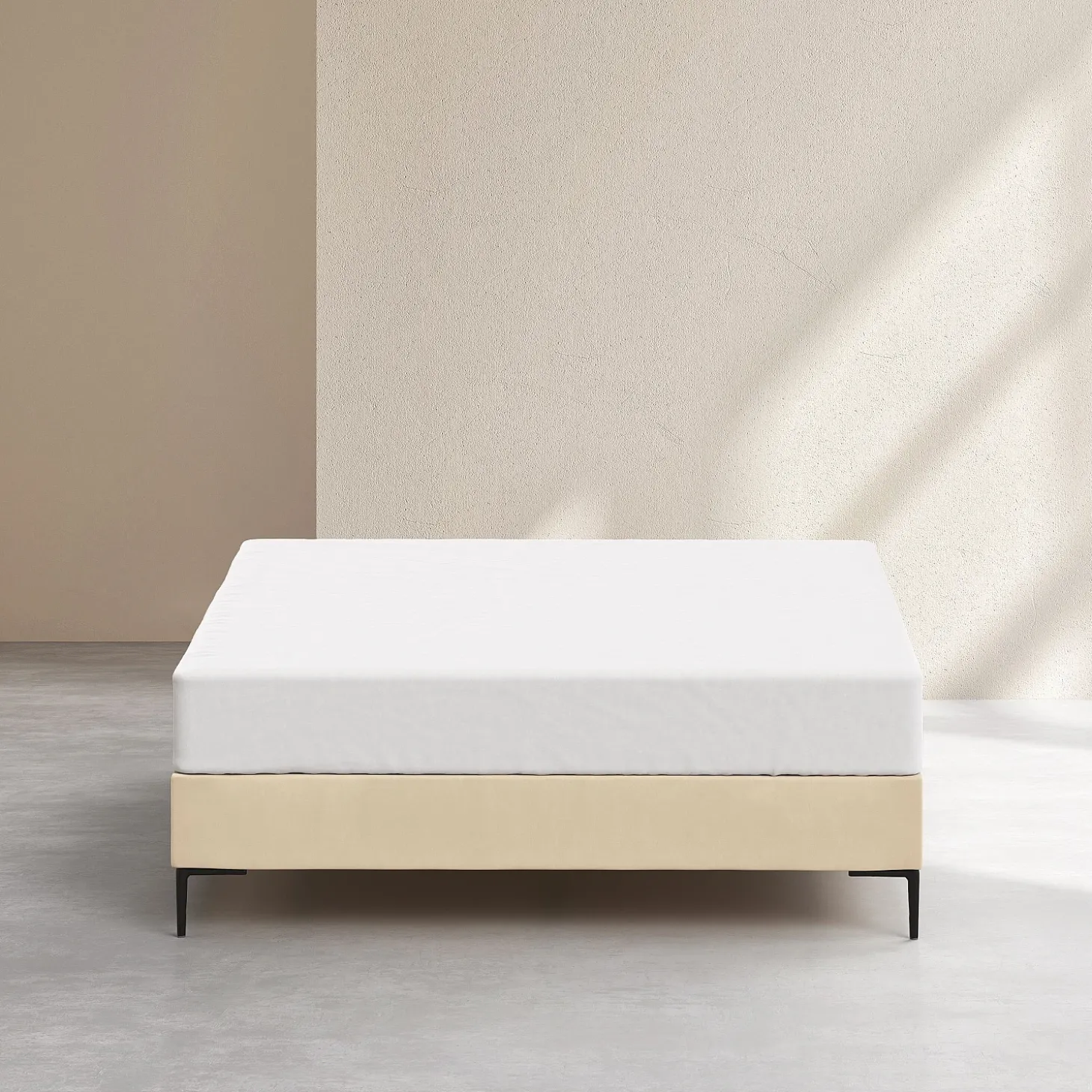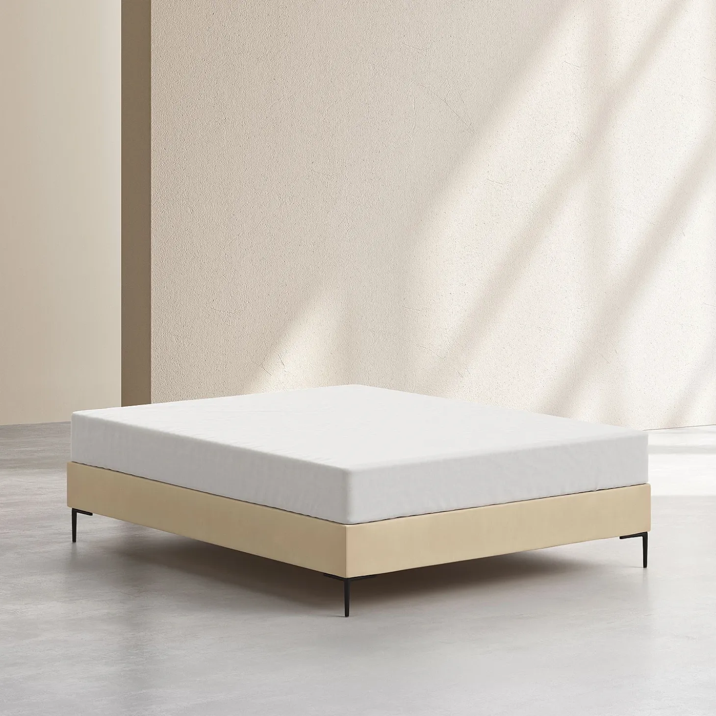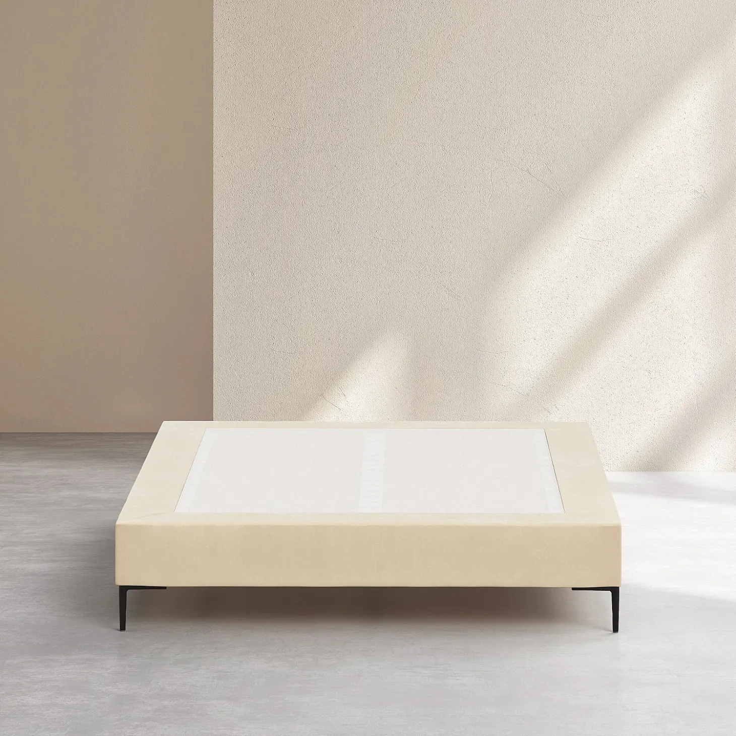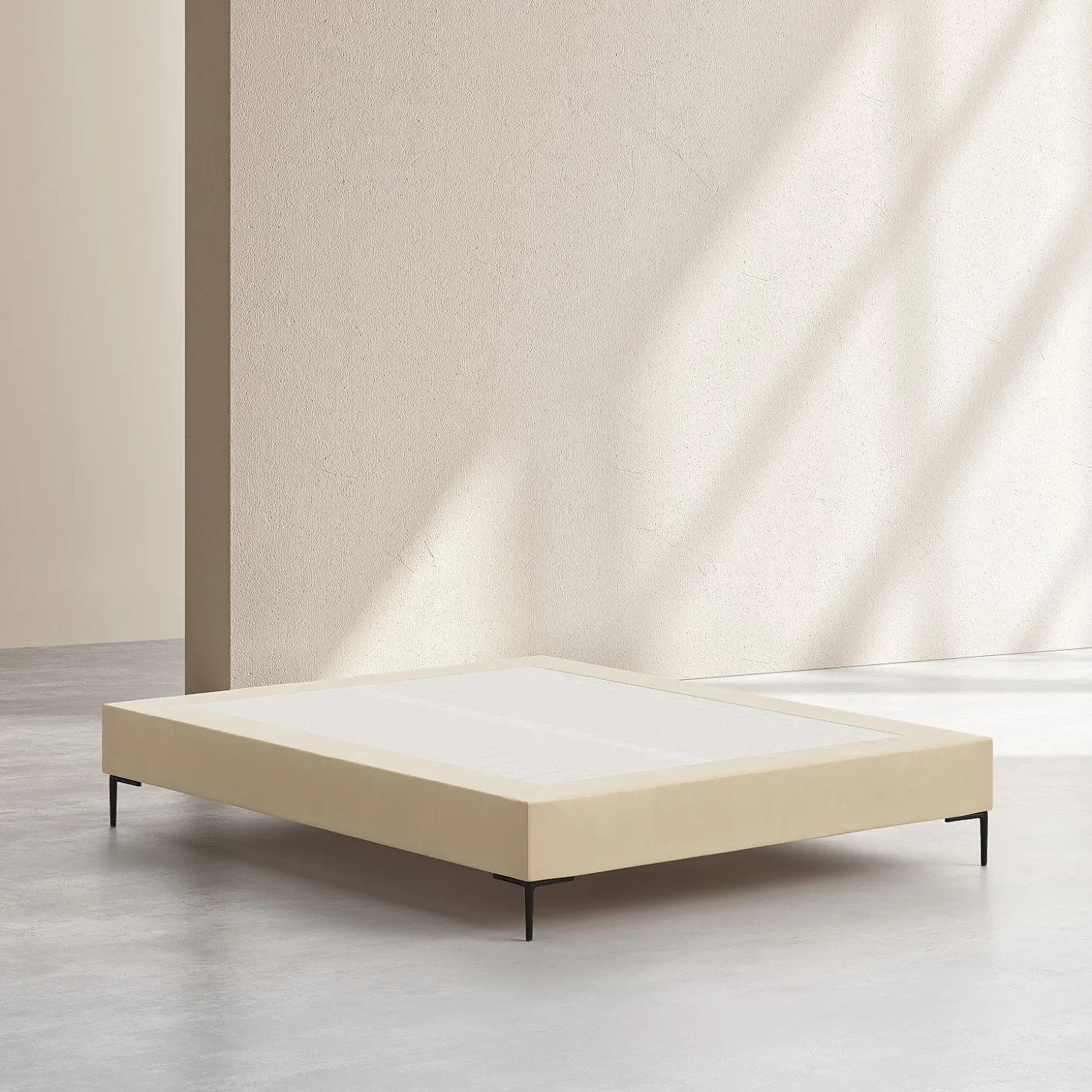 Son cadre repose sur des pieds fins en métal noir, apportant une touche graphique et contemporaine. La douceur du revêtement en tissu réchauffe la pièce, et la sobriété de sa couleur crème s’associe facilement à une tête de lit afin de personnaliser l’ensemble.