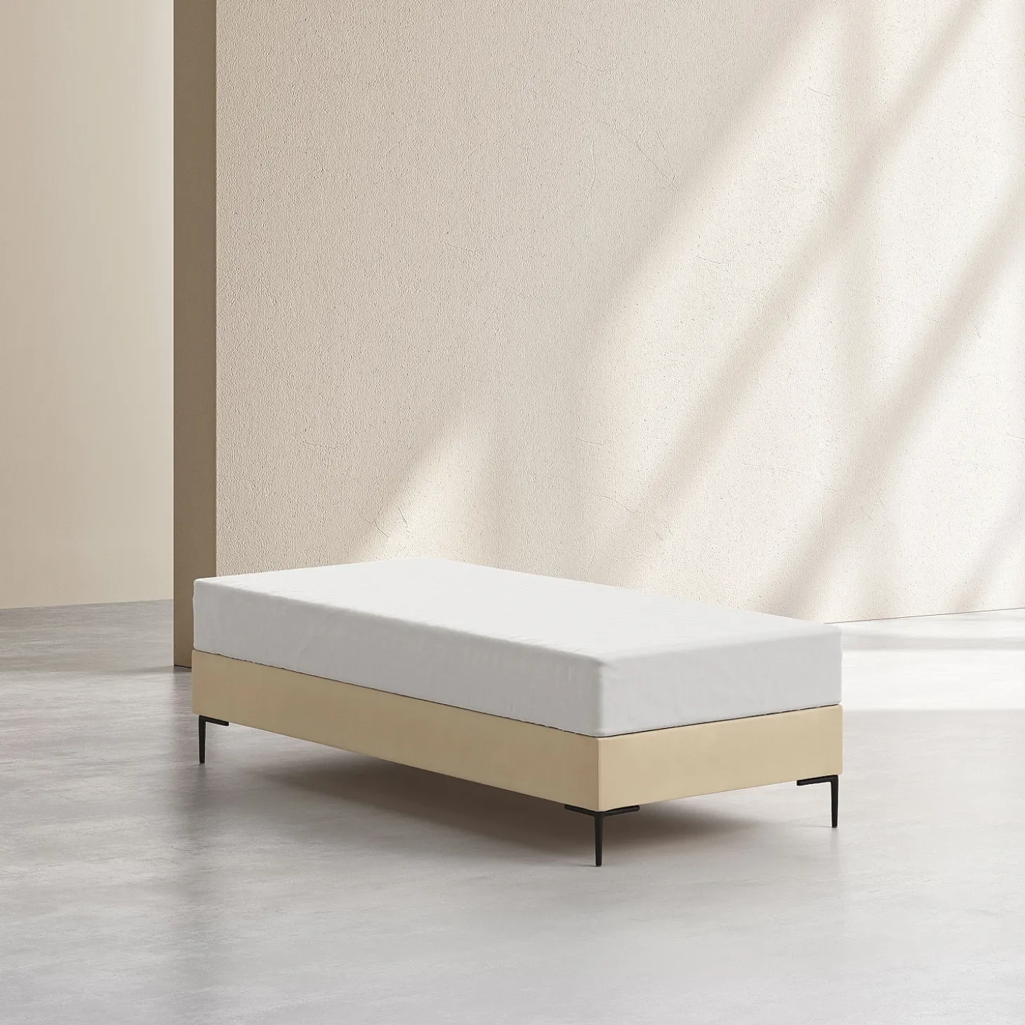 Son cadre repose sur des pieds fins en métal noir, apportant une touche graphique et contemporaine. La douceur du revêtement en tissu réchauffe la pièce, et la sobriété de sa couleur crème s’associe facilement à une tête de lit afin de personnaliser l’ensemble.