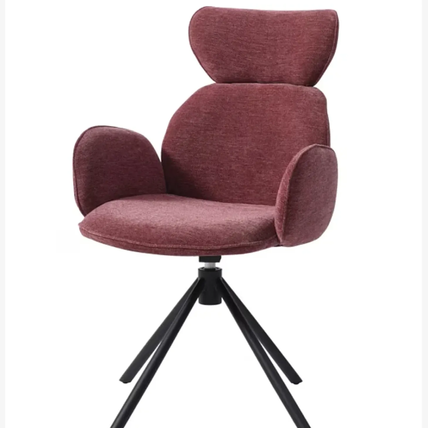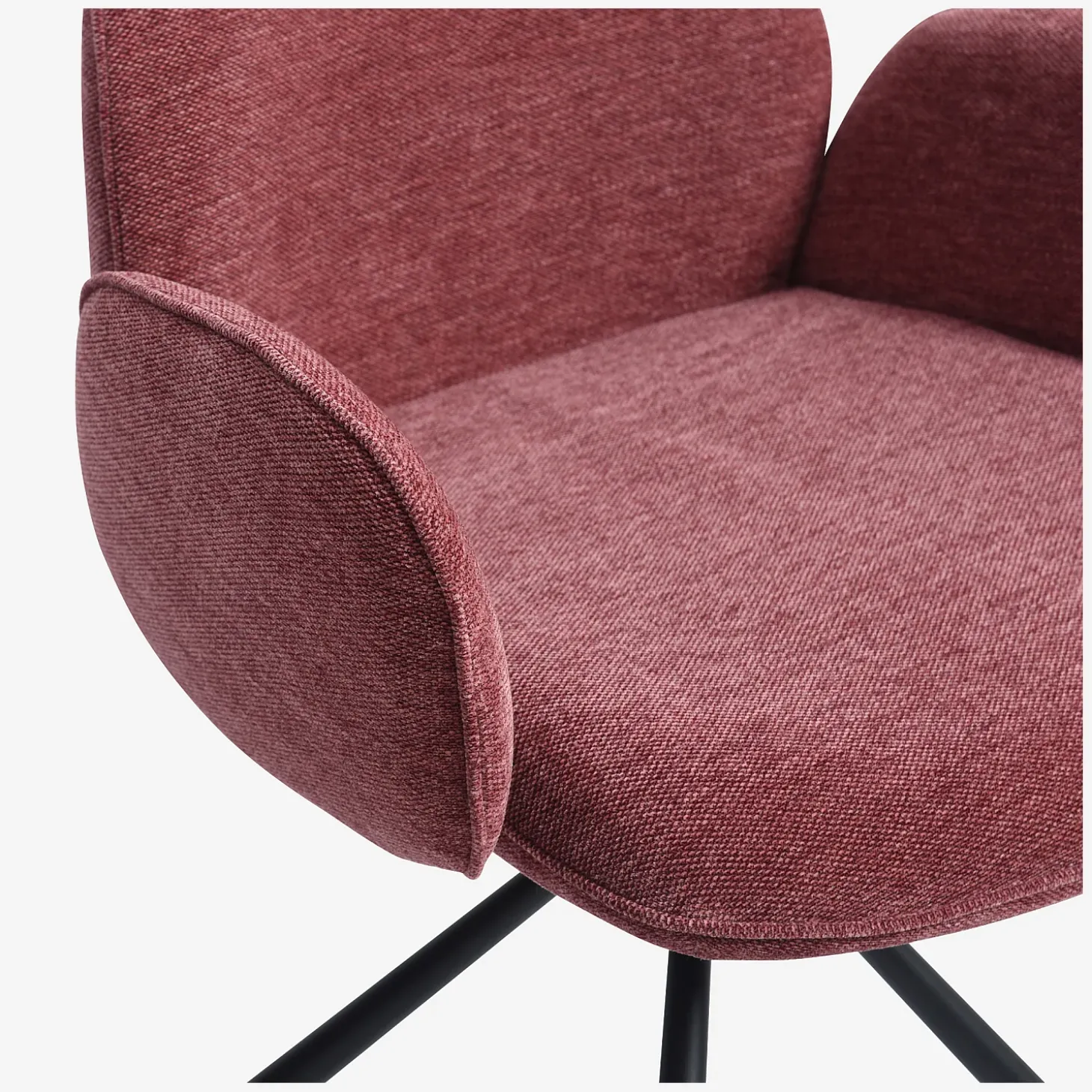 Ses pieds en métal noir mat apportent une touche graphique, tandis que son revêtement en tissu doux rouge parme insuffle une personnalité affirmée et chaleureuse à la pièce.