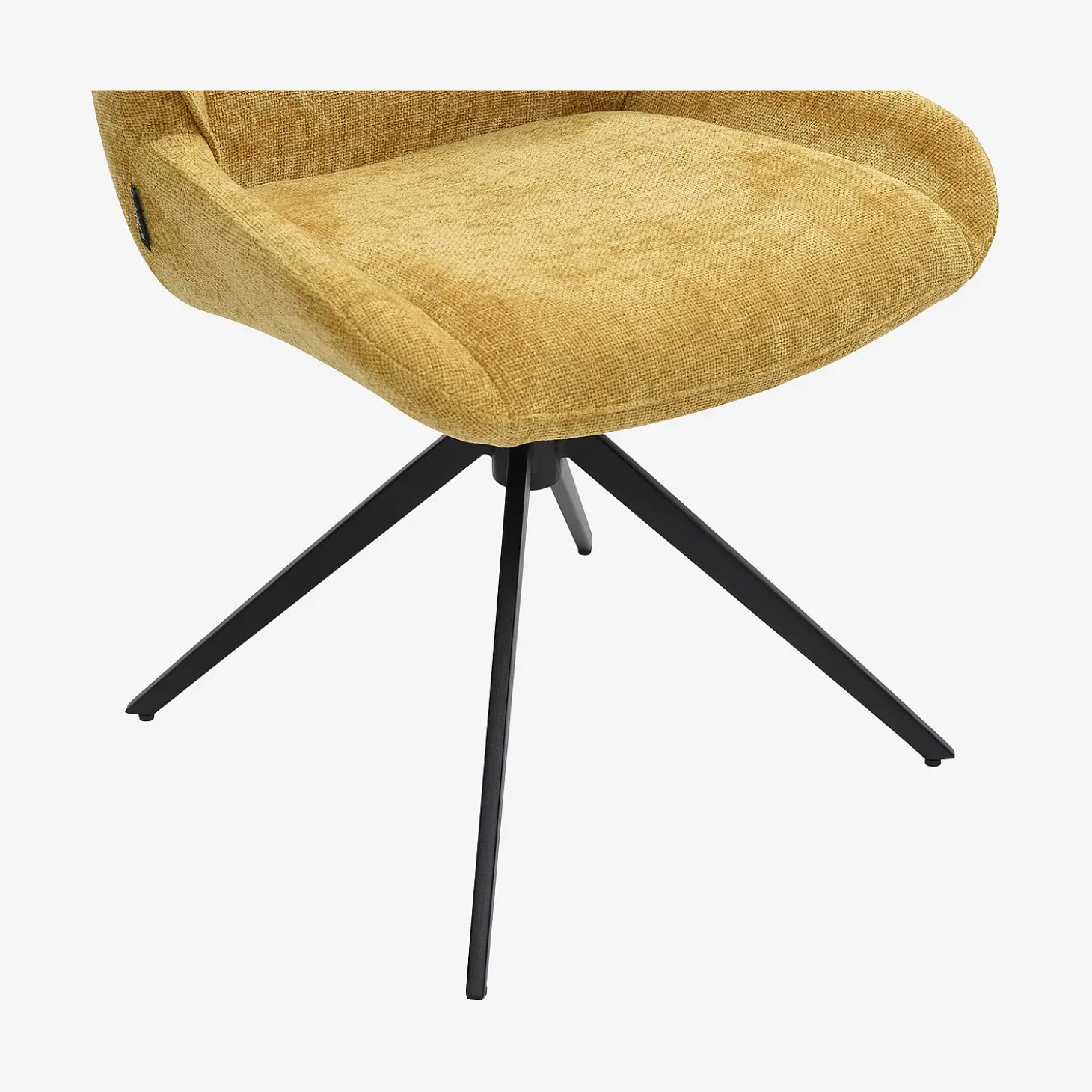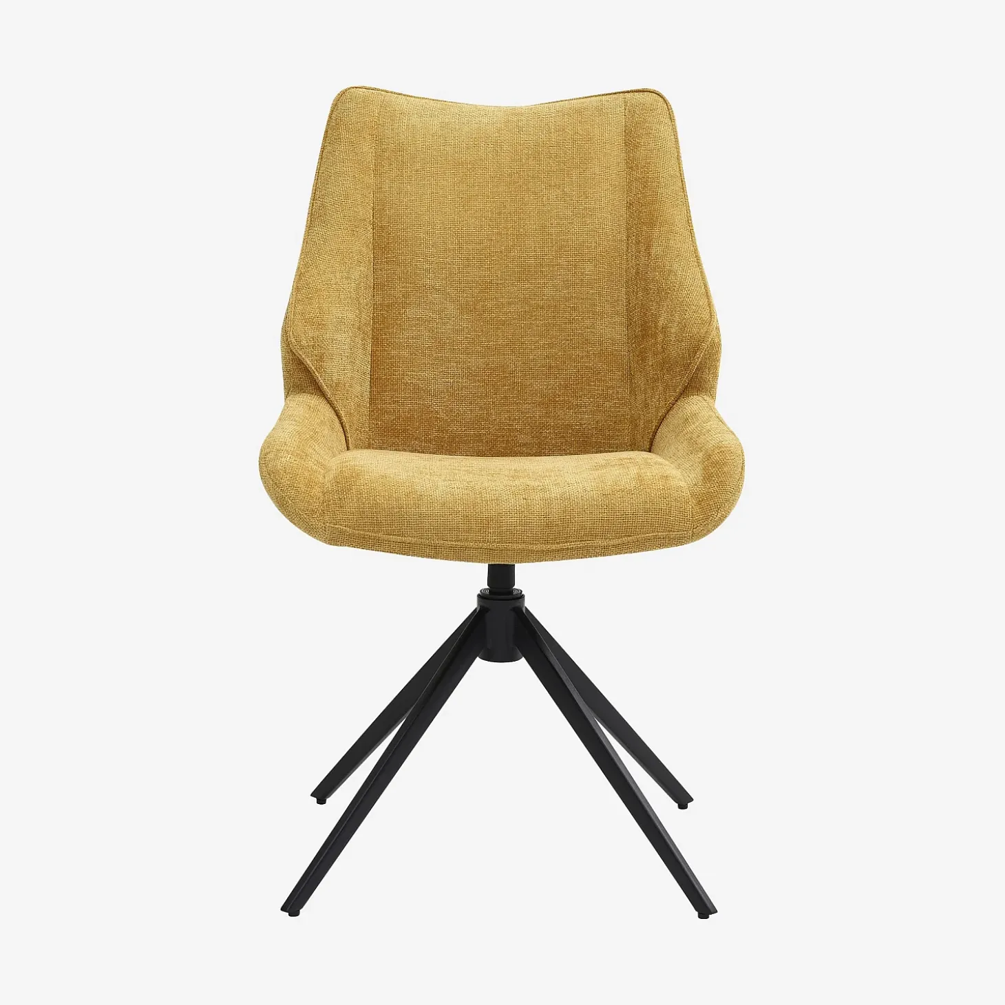 Leur revêtement en tissu chenille, au toucher doux et à l’aspect subtilement texturé, est mis en valeur par une teinte miel chaleureuse. Ce coloris lumineux souligne l’élégance de la chaise tout en apportant une note solaire à la pièce.