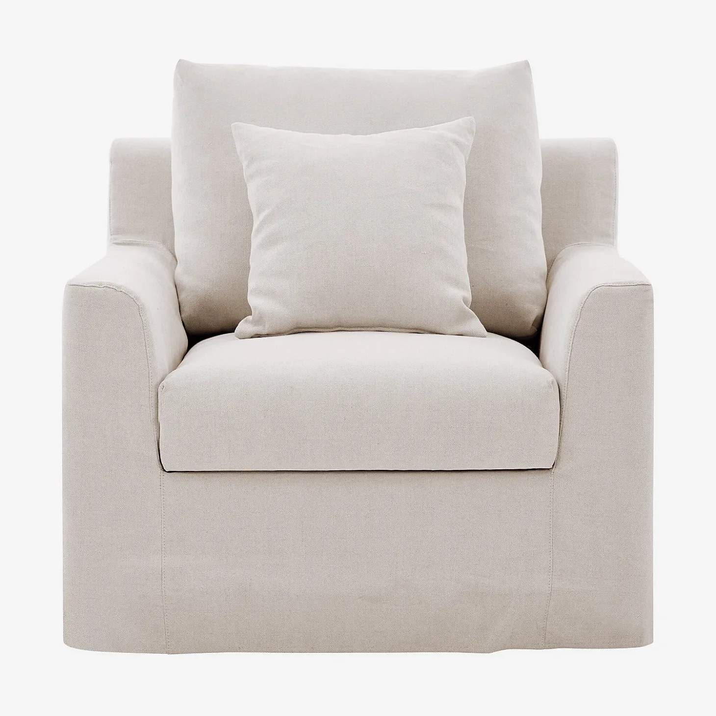 Son garnissage moelleux assure un confort enveloppant, idéal pour s’accorder une parenthèse de repos. Habillé d’un tissu en coton et lin, il présente une texture douce et légèrement irrégulière, qui renforce son charme brut et décontracté. Sa couleur sable blanc s’intègre avec simplicité dans de nombreuses ambiances en apportant luminosité et douceur.
