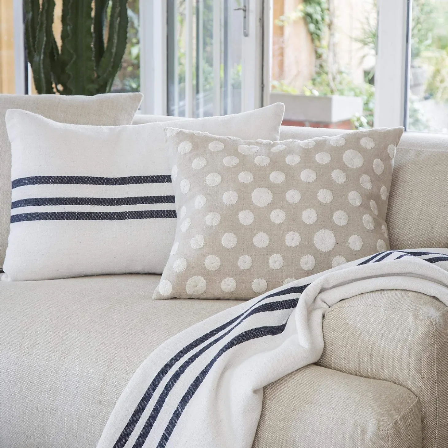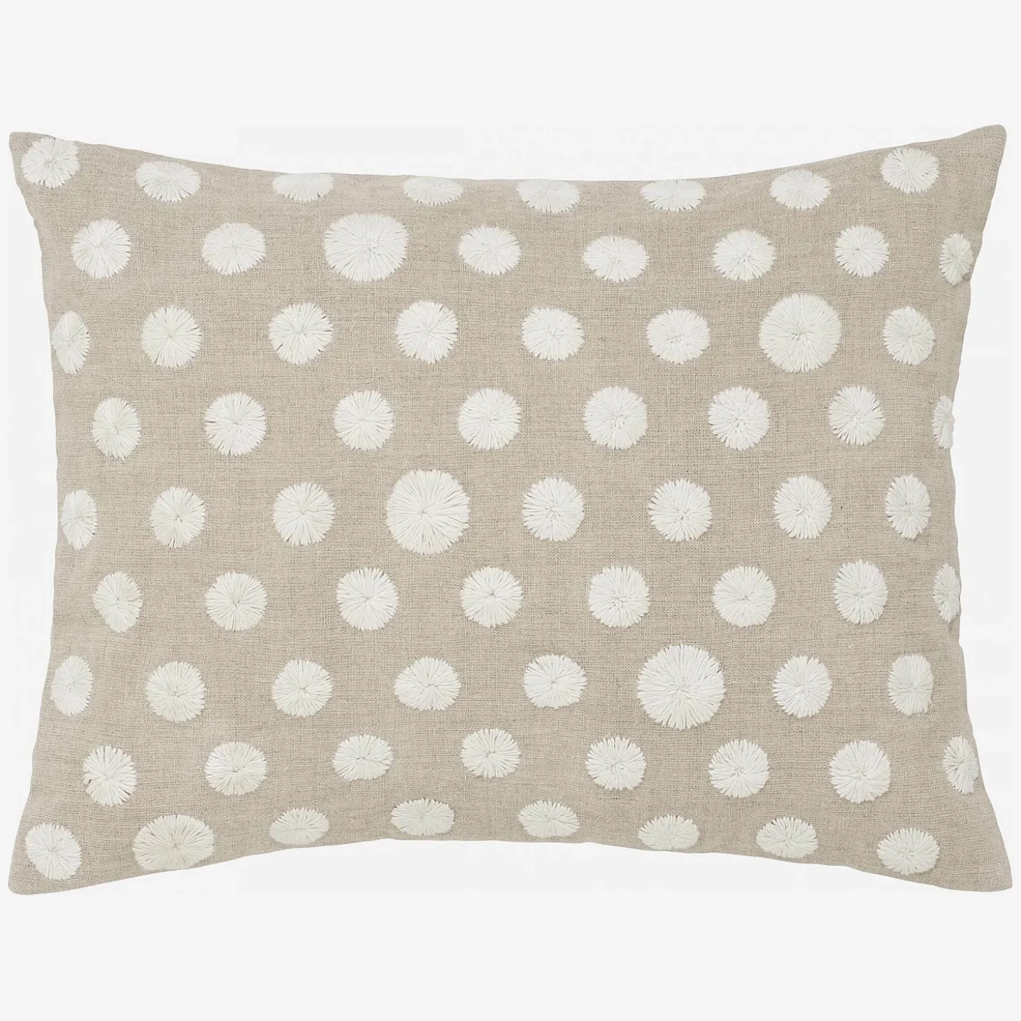 Padoue est un coussin inspiré de la nature. Sa toile de lin est parsemée de fleurs blanches brodées.