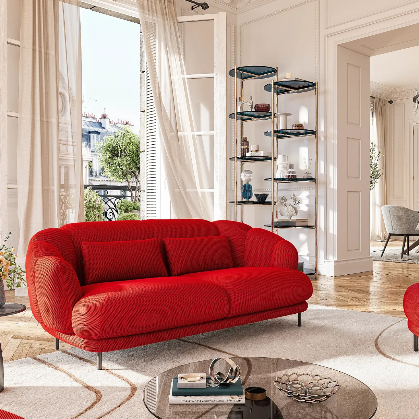 Le canapé 3 places Paraty en tissu 3D insuffle un caractère envoûtant dans le salon. Sa teinte rouge coquelicot éclatante illumine une décoration pour un ensemble glamour et audacieux, renforcé par ses deux coussins assortis.