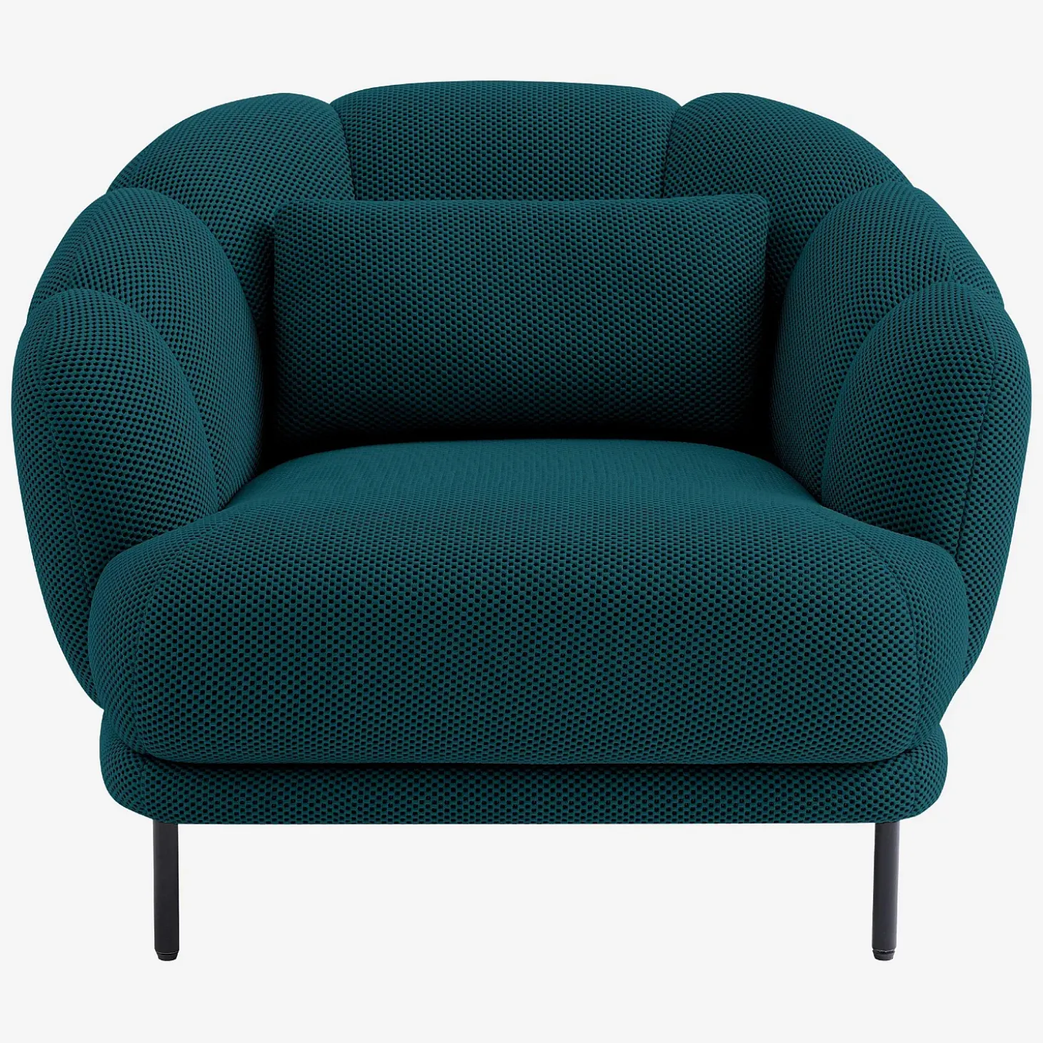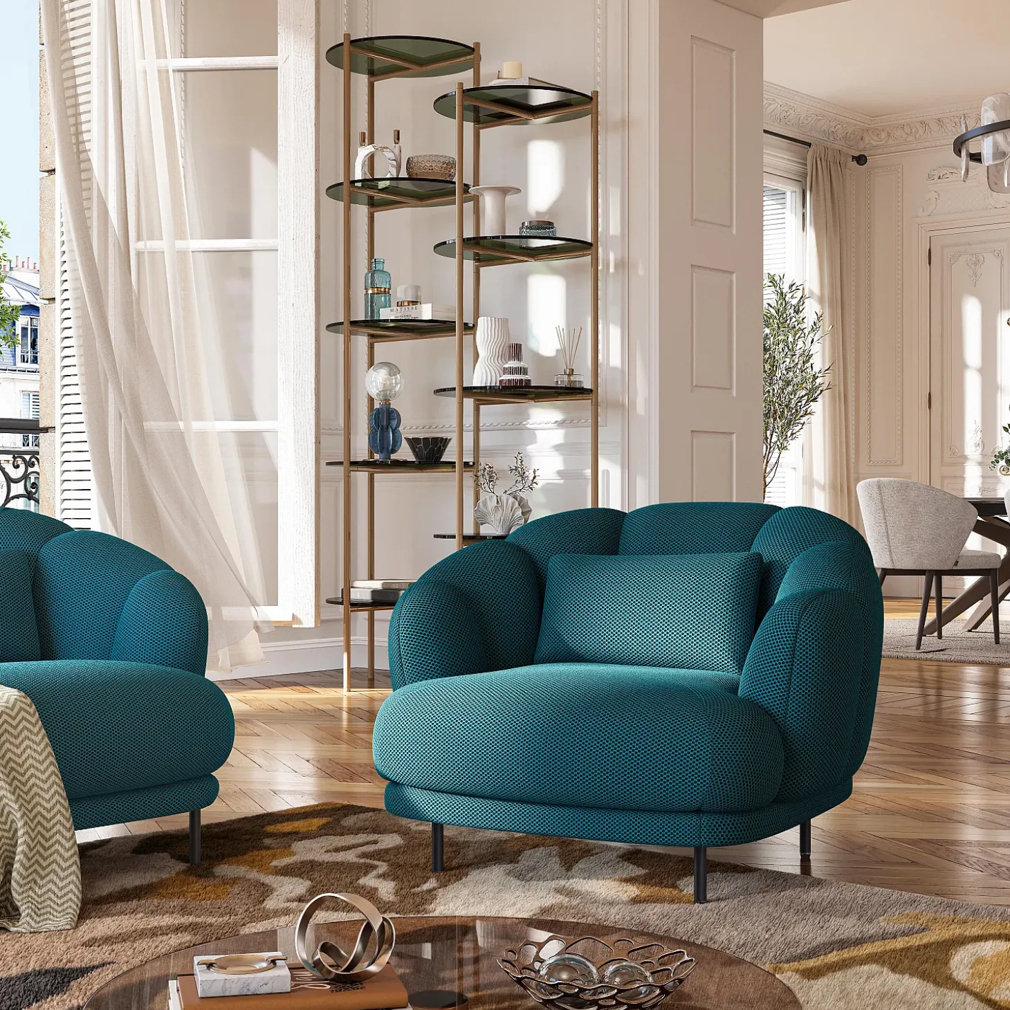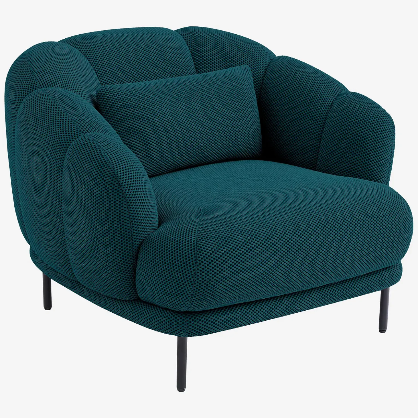 Le fauteuil Paraty en tissu 3D est sublimé par un piètement fin et délicat en métal noir mat, lui conférant une élégance aérienne. Sa teinte bleu canard égaye une décoration pour un ensemble coloré et vibrant, renforcé par son coussin assorti.