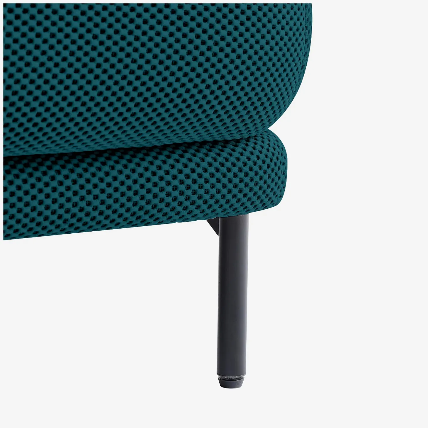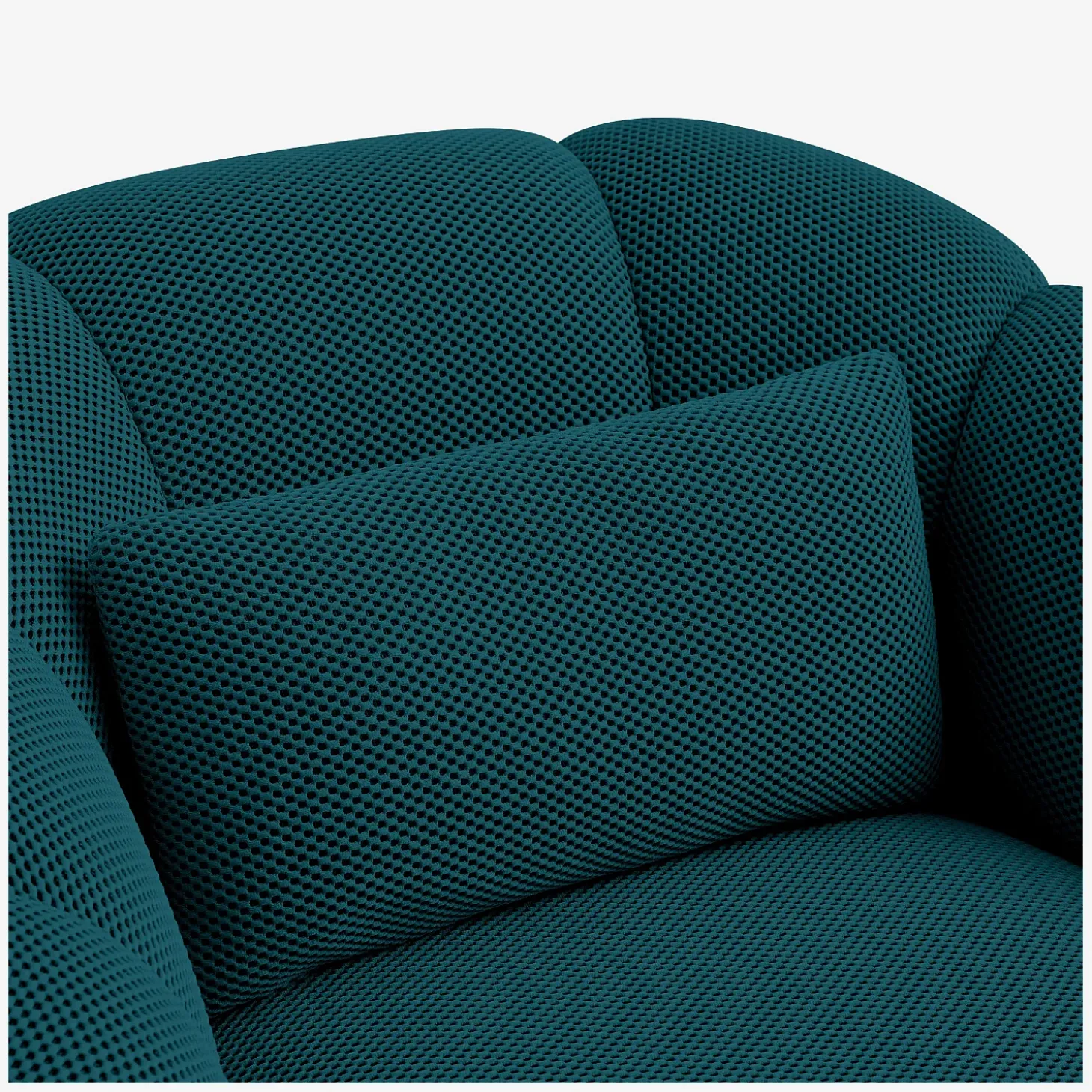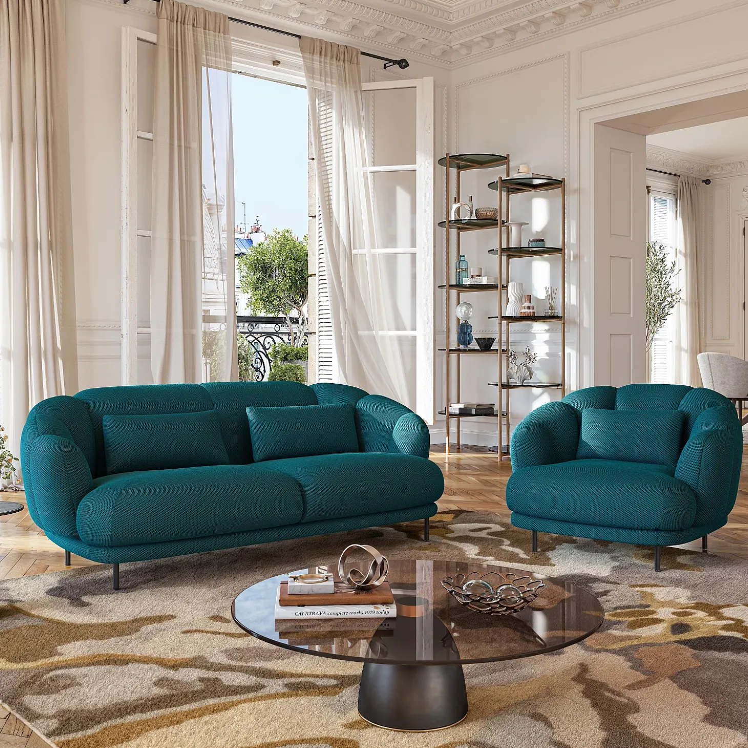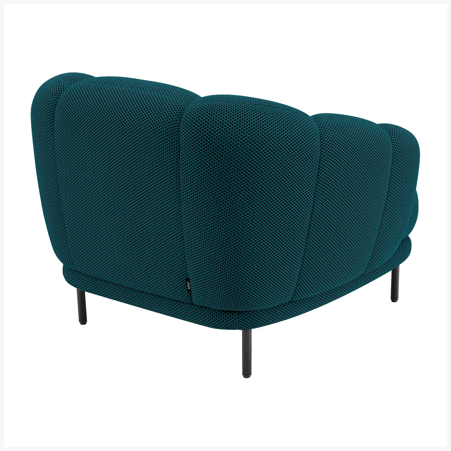 Le fauteuil Paraty en tissu 3D est sublimé par un piètement fin et délicat en métal noir mat, lui conférant une élégance aérienne. Sa teinte bleu canard égaye une décoration pour un ensemble coloré et vibrant, renforcé par son coussin assorti.