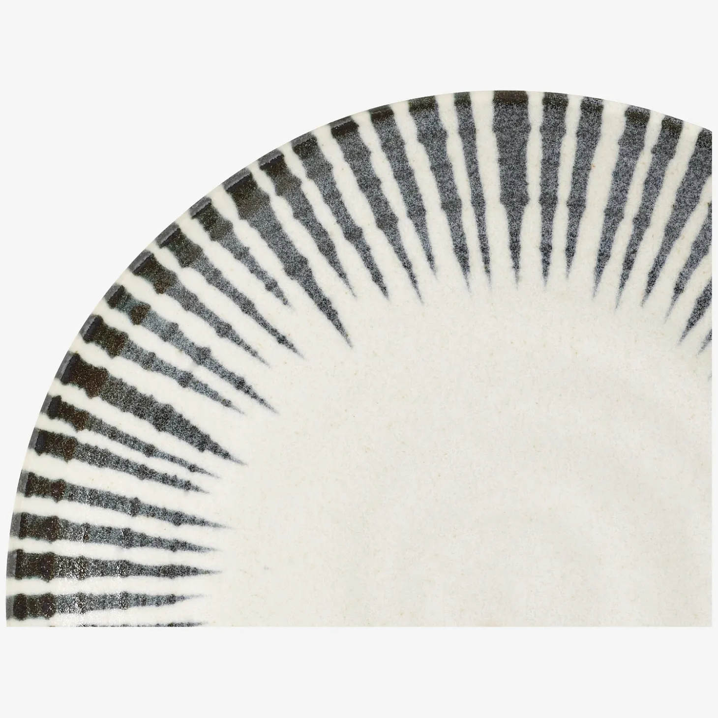 L’assiette plate Pinako en porcelaine mesure 26 cm de diamètre. Son motif à lignes bleues a été appliqué au tampon.