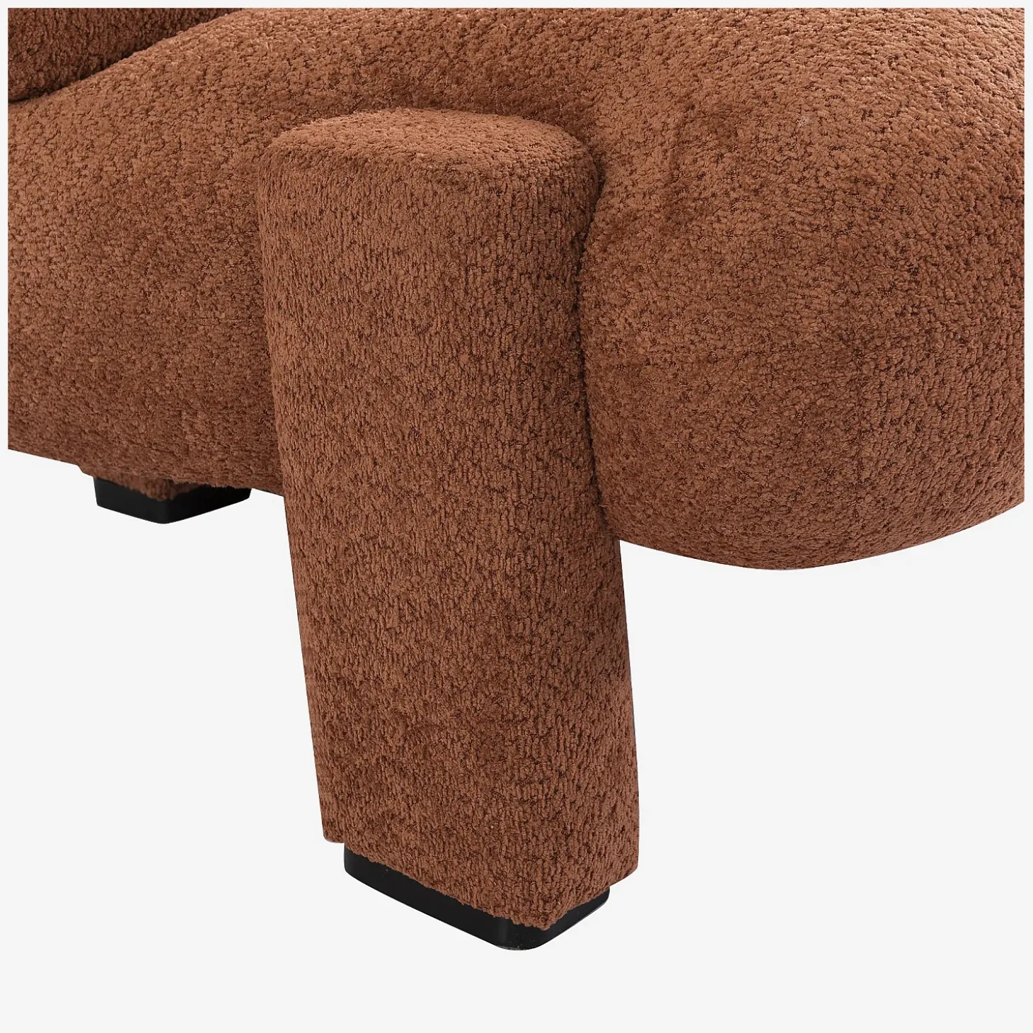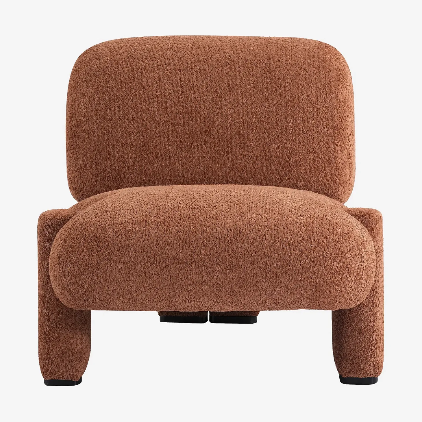 Revêtu d’un tissu bouclette terracotta, il séduit par une allure chaleureuse et lumineuse qui réchauffe l’espace. Ses lignes arrondies et sa posture légèrement inclinée invitent naturellement à la détente.