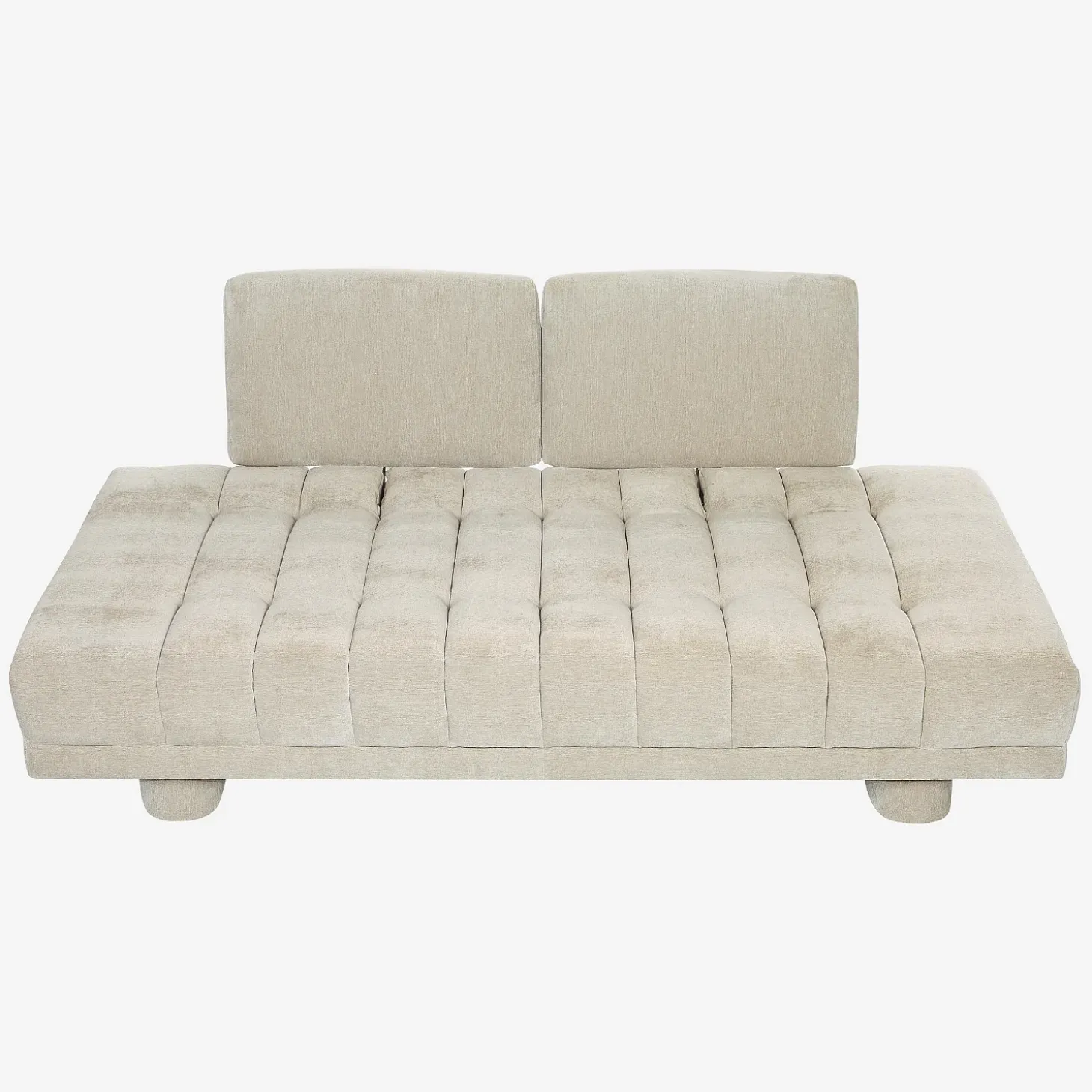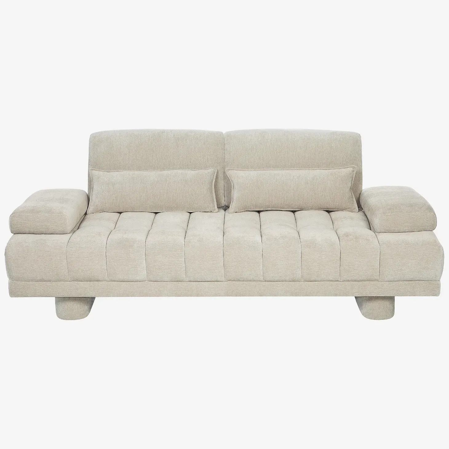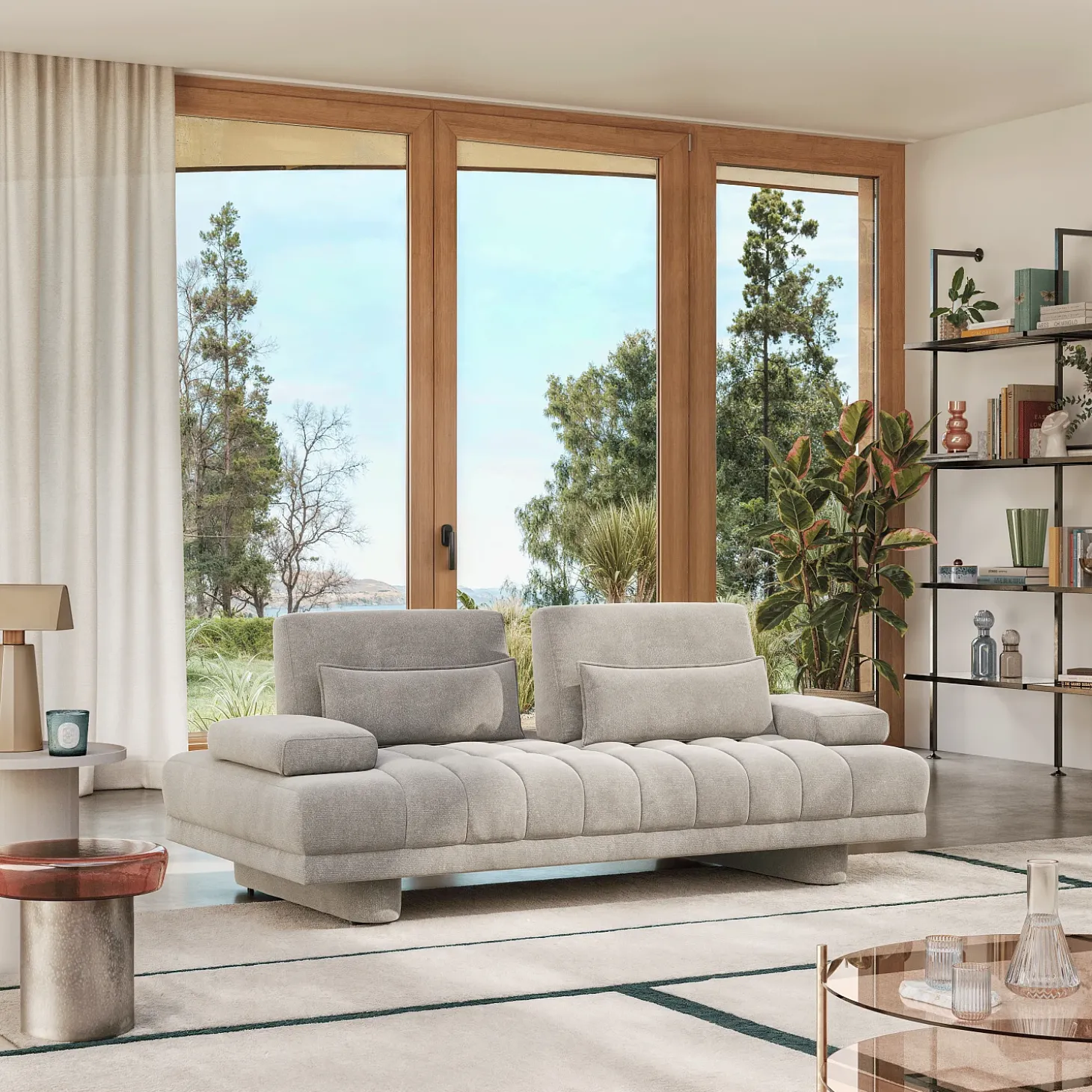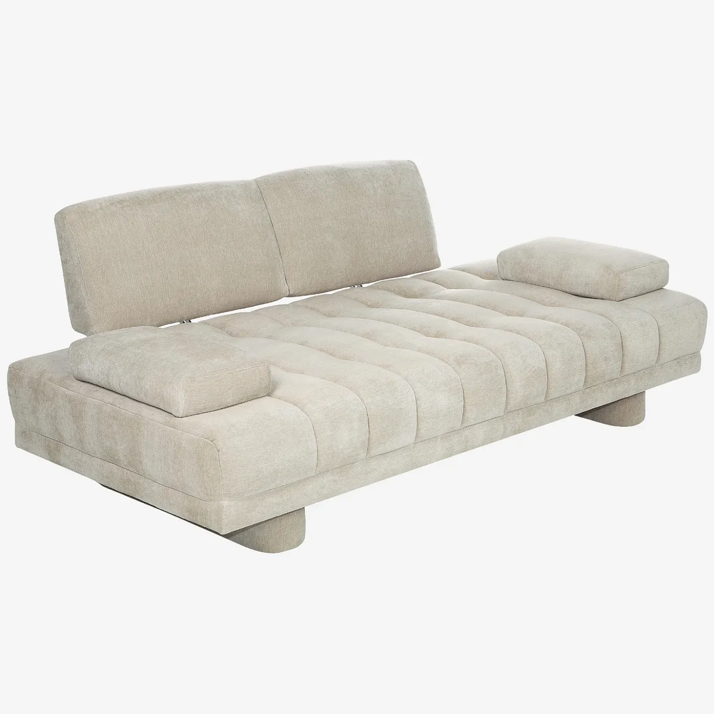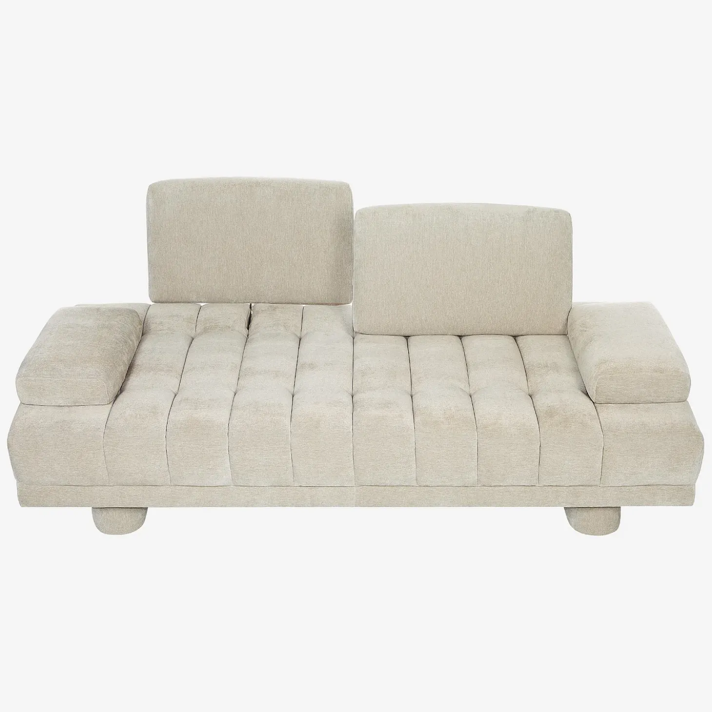 L’allure épurée de ce canapé, avec une assise à la fois matelassée et capitonnée, crée un espace de détente raffiné. Sa silhouette unique, aux pieds à l’allure innovante, se démarque des modèles plus classiques.