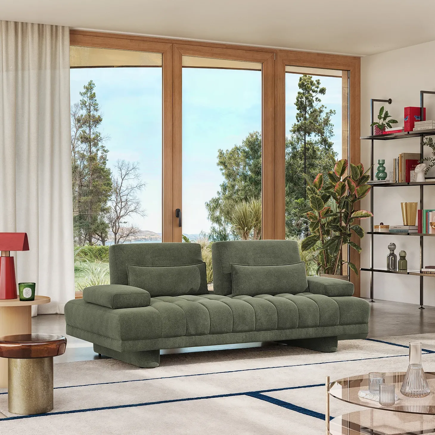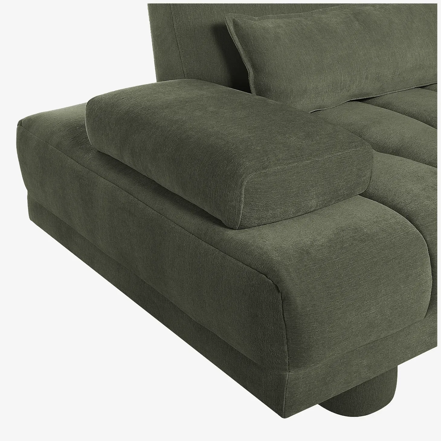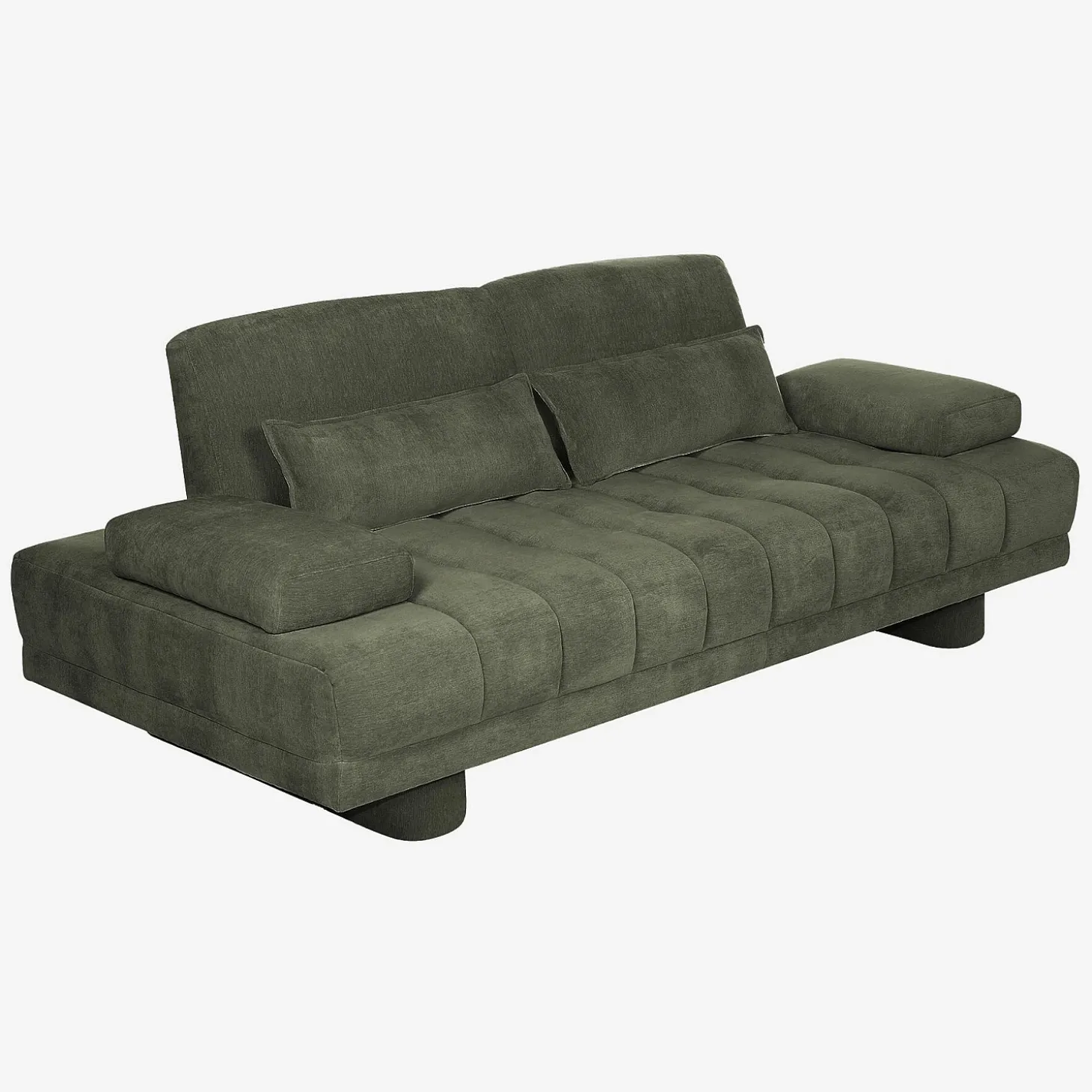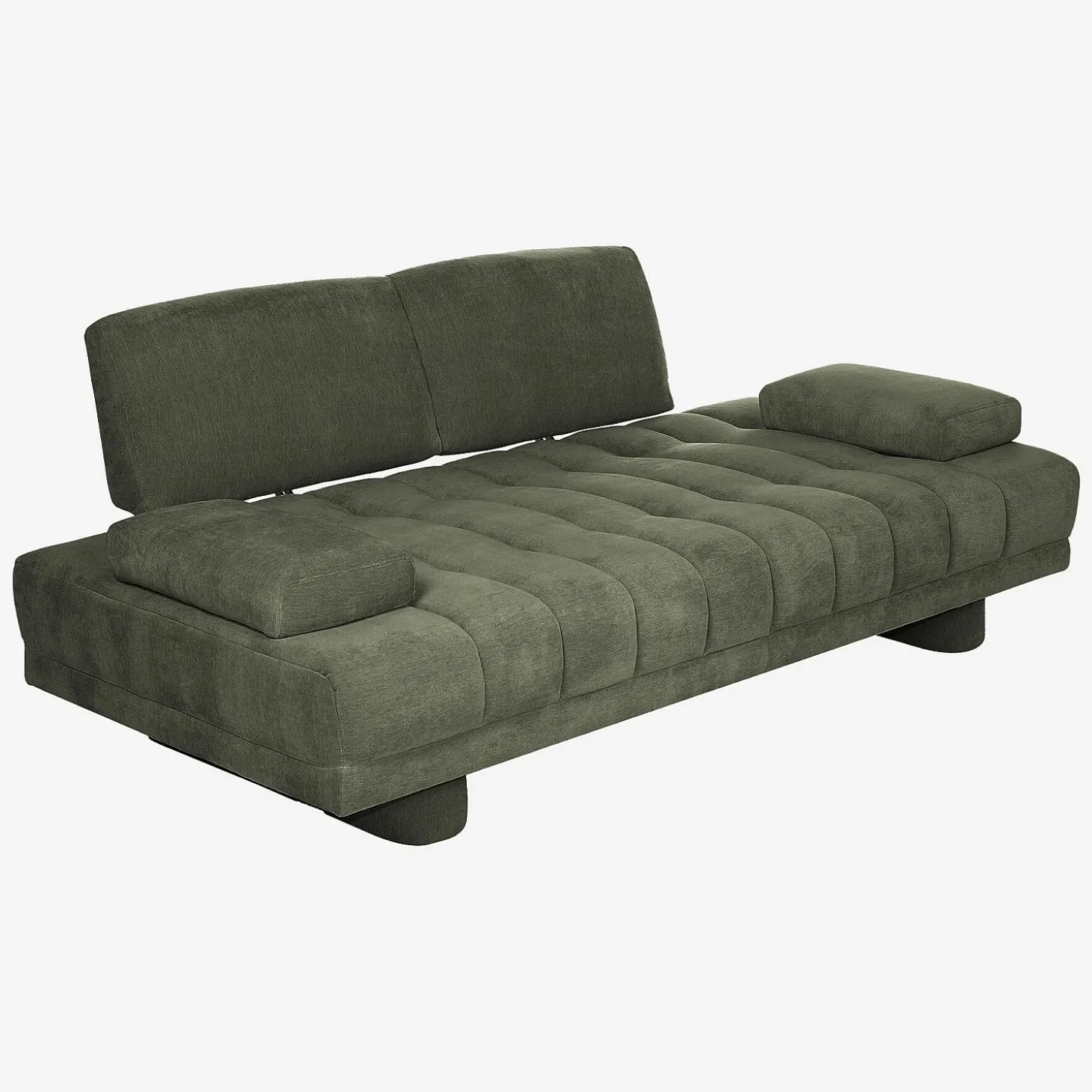 Revêtu d’un délicat tissu vert kaki, il révèle une teinte chaleureuse et discrète qui ajoute une aura organique à un intérieur.