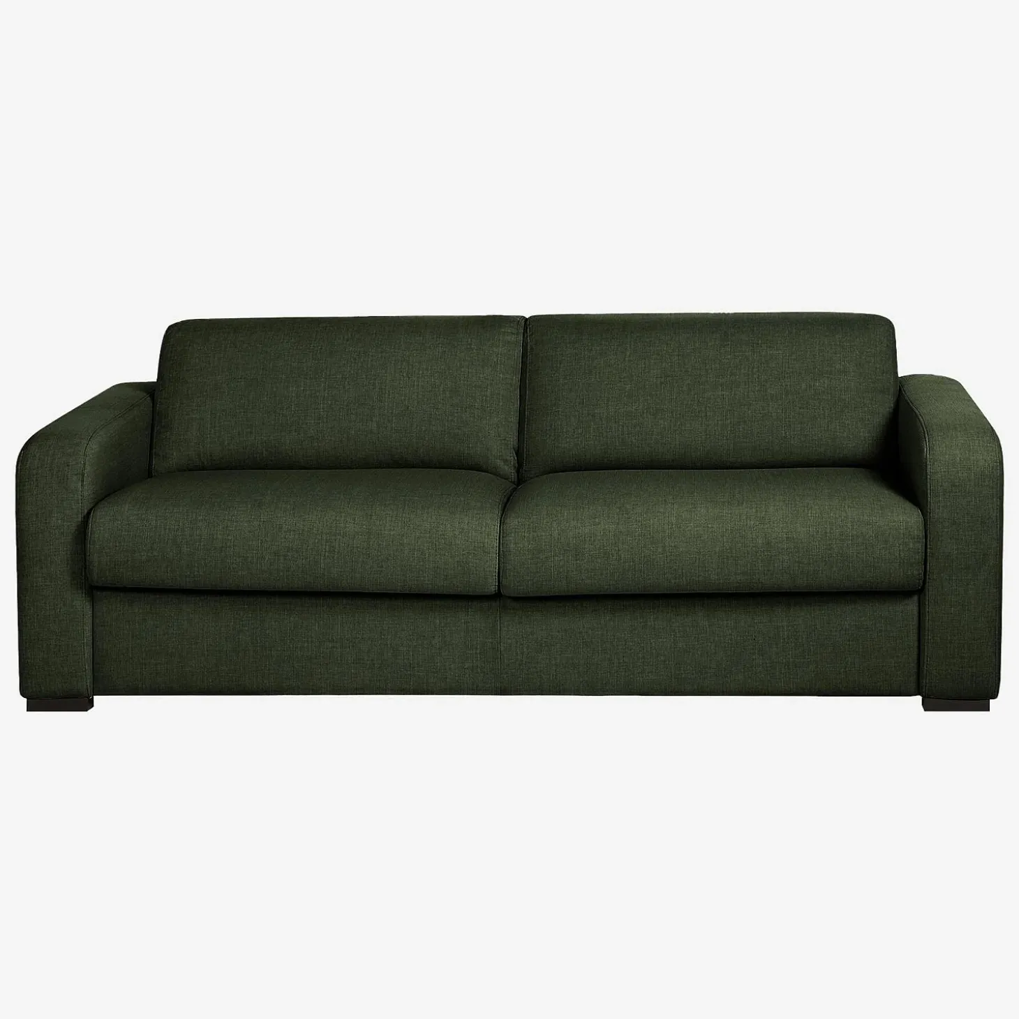 Le canapé convertible 2 places Porto est habillé d’un tissu Lipari texturé, au coloris vert foncé naturel et apaisant. Allié pratique pour un usage serein, ce revêtement déperlant garantit une protection efficace contre les éclaboussures.