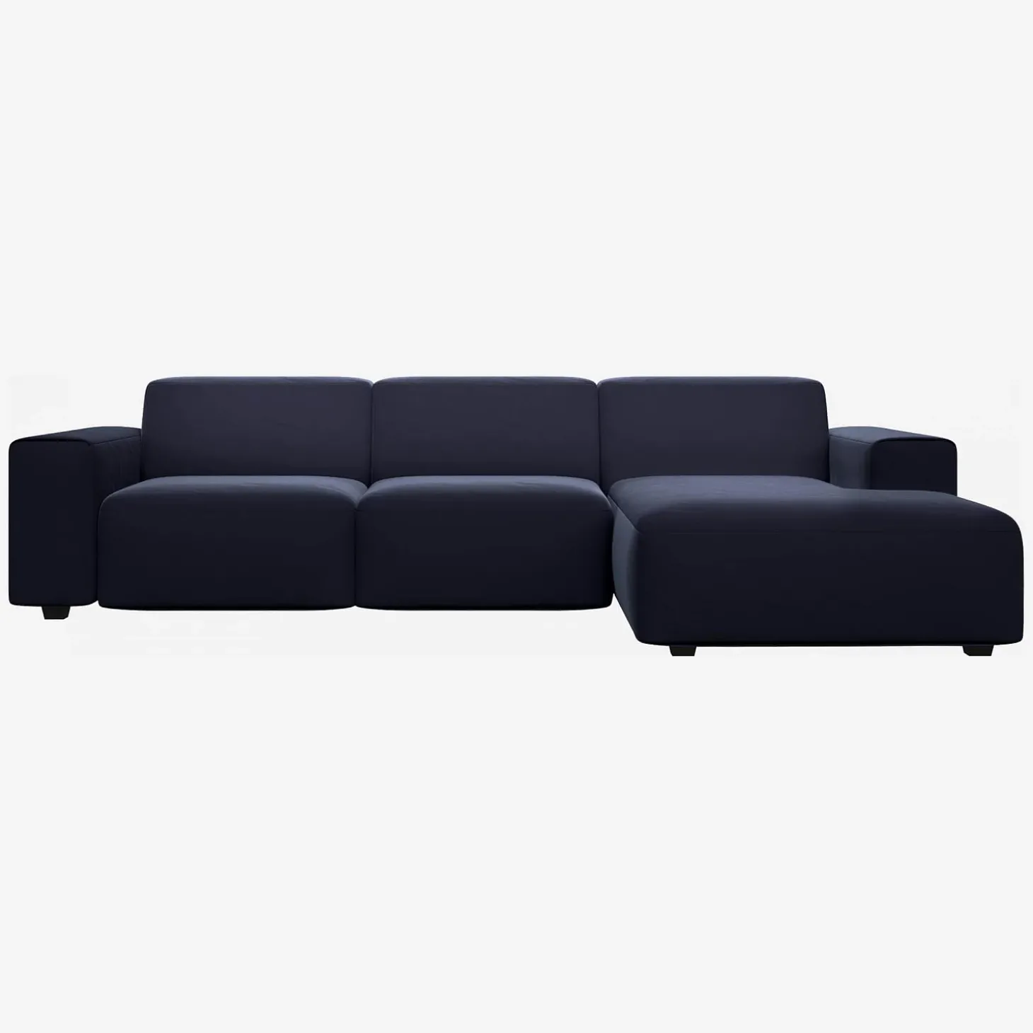 Le canapé d’angle droit Posada en velours bleu encre est un canapé d’une grande élégance. Son design soigné se retrouve dans ses coutures et les finitions en ourlet de ses accoudoirs.