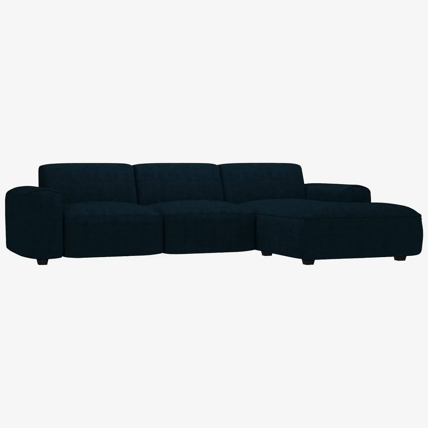 Le canapé d’angle droit Posada en tissu Melina bleu encre est un canapé d’une grande élégance. Son design soigné se retrouve dans ses coutures et les finitions en ourlet de ses accoudoirs.