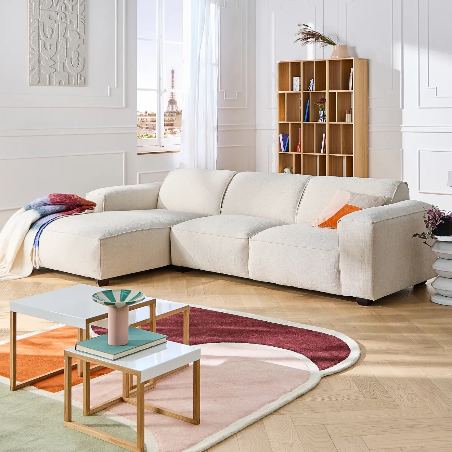 Le canapé d’angle gauche Posada II est habillé d’un tissu Mira en bouclette courte tendance. Ce revêtement apporte un relief subtil et chaleureux, mis en valeurs par un coloris ivoire lumineux.