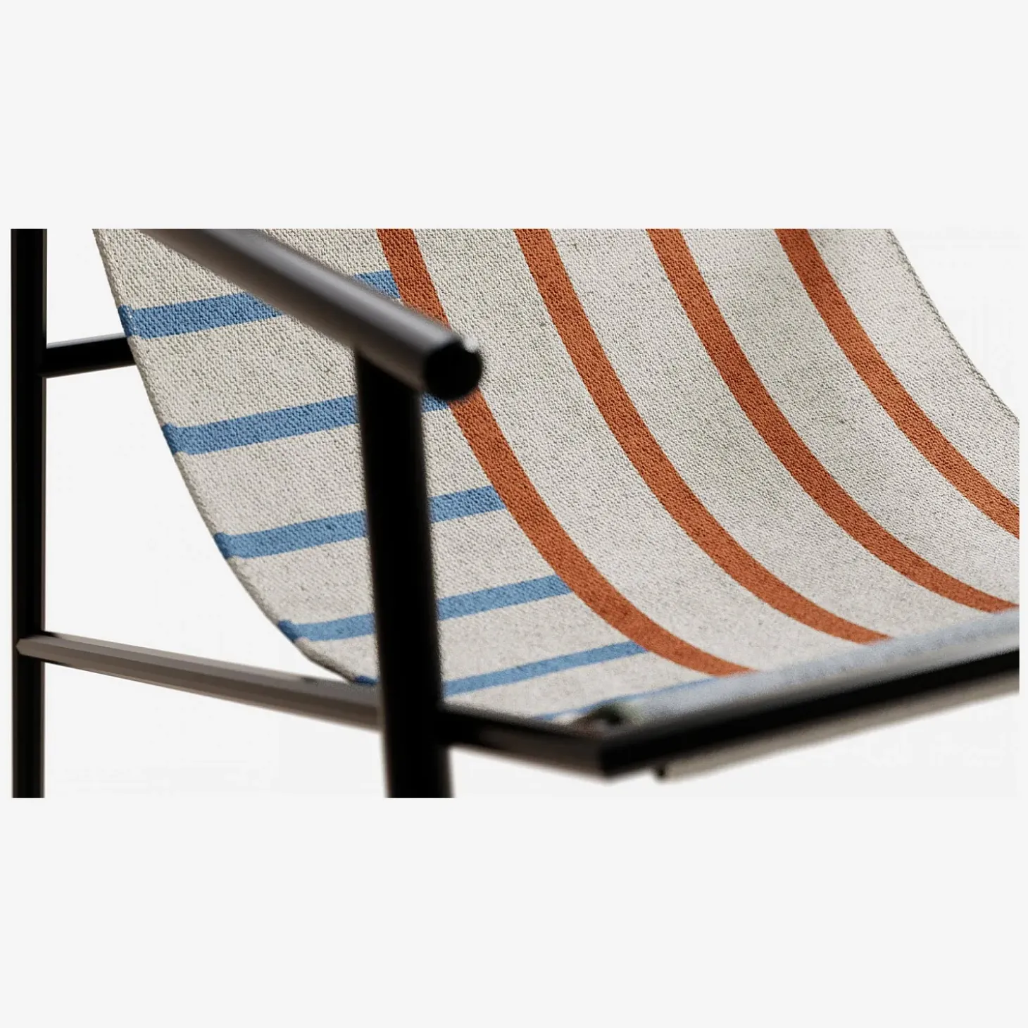 Cette assise se compose d’une structure en métal noire et d’une toile tendue en coton. Cette dernière se pare d’un motif exclusif, signé Floriane Jacques, graphiste au sein du Habitat Design Studio. Il met en scène un jeu de lignes colorées et intemporel pour intégrer en douceur tous les styles de décoration.
