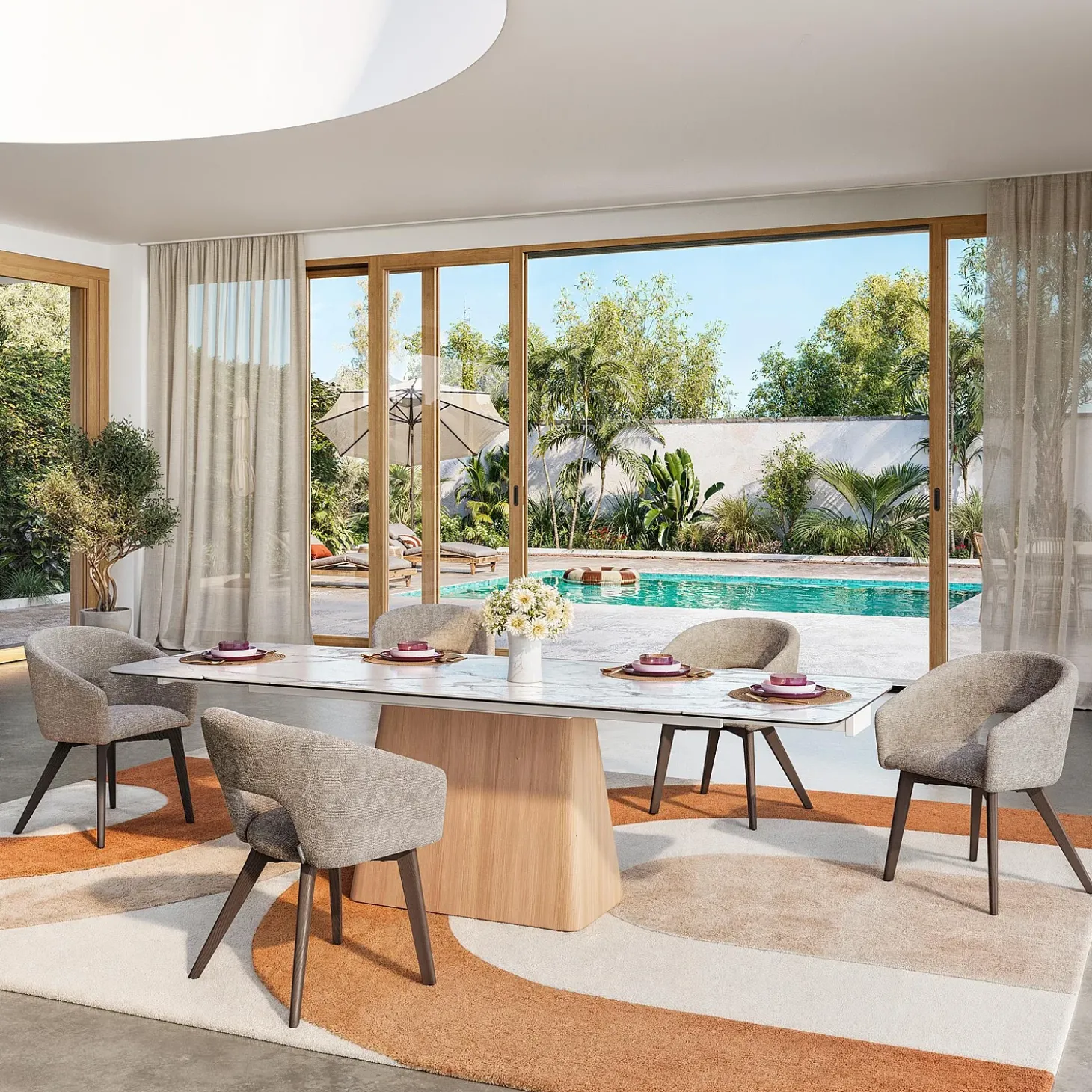 L’harmonie entre le beige lumineux du tissu et l’intensité du noyer confère à la salle à manger une atmosphère noble et distinguée.