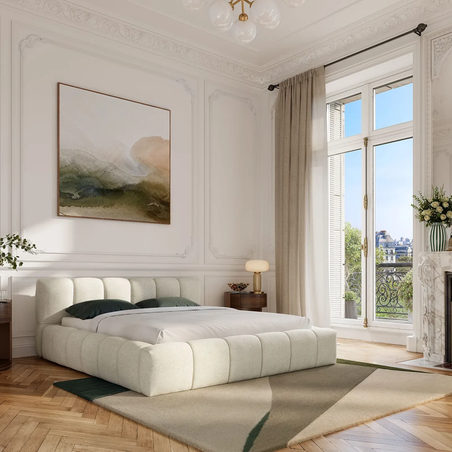 Certaines photos d’ambiance peuvent comporter de légères variations par rapport au modèle réel.Setana, l’art d’allier confort enveloppant et praticité discrète dans un design contemporain. Un écrin spacieux où le sommeil devient une expérience exceptionnelle.