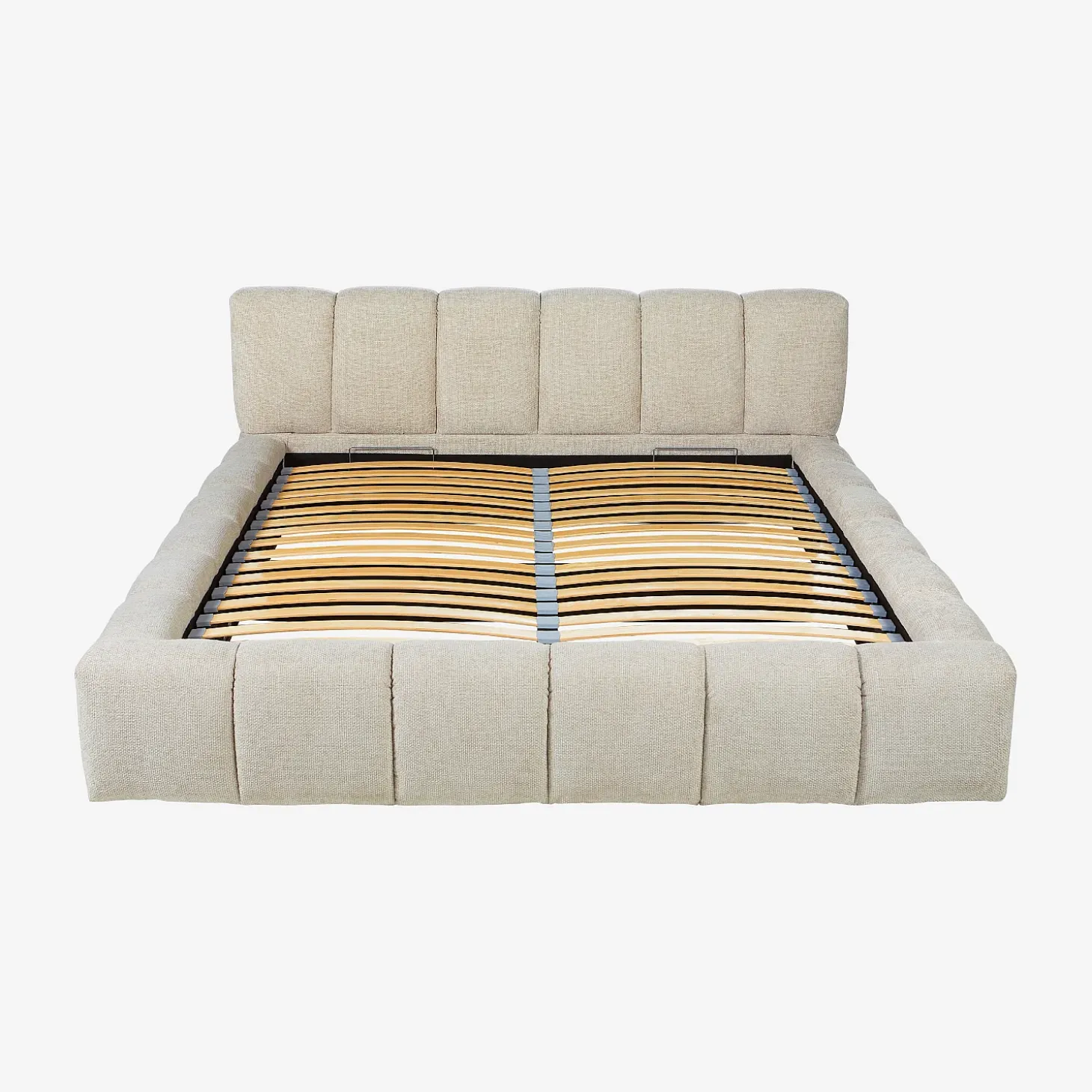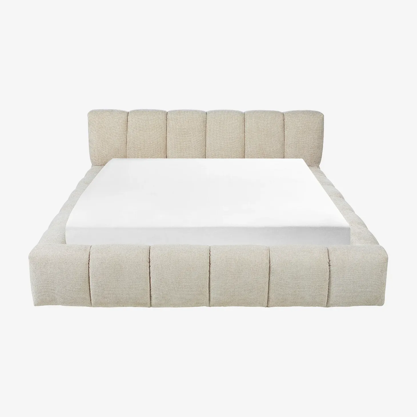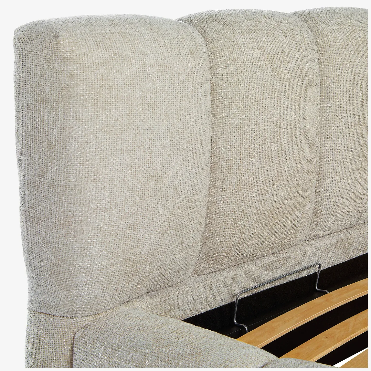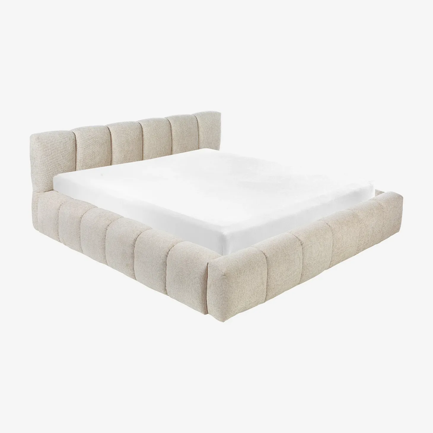 Véritable cocon, sa tête de lit garnie de mousse invite à s’y adosser pour profiter d’un moment de détente avant la nuit. Son revêtement en tissu chenille assure un toucher doux et délicat, sublimé d’une teinte de crème subtile. L’effet monochrome se poursuit sur le cadre de lit, pour un ensemble contemporain assumé.