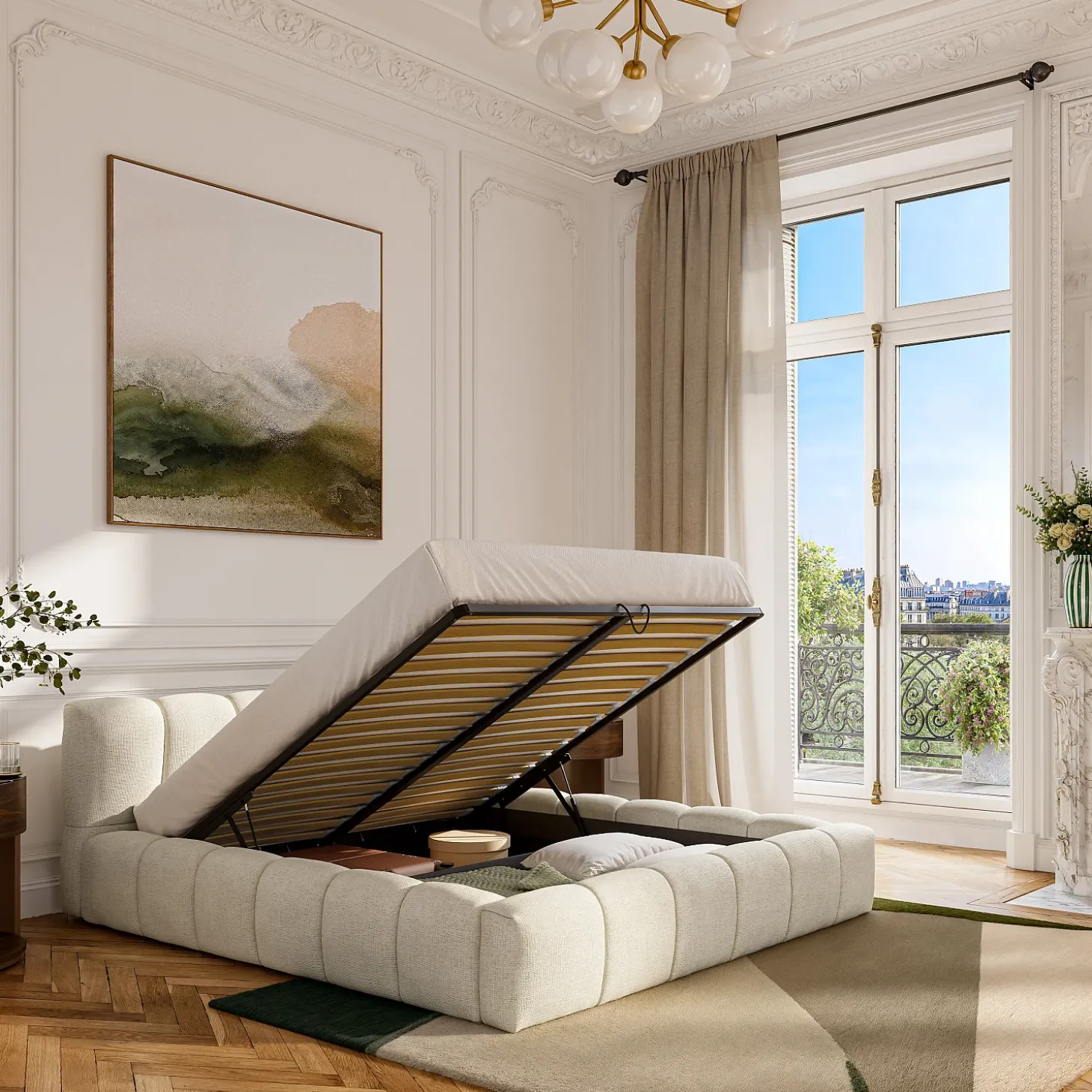 Atout indispensable d’une chambre ordonnée, ce lit cache un rangement astucieux grâce à son coffre. Le mécanisme de vérins à gaz accompagne l’ouverture et la fermeture, garantissant une utilisation facile et sécurisée.