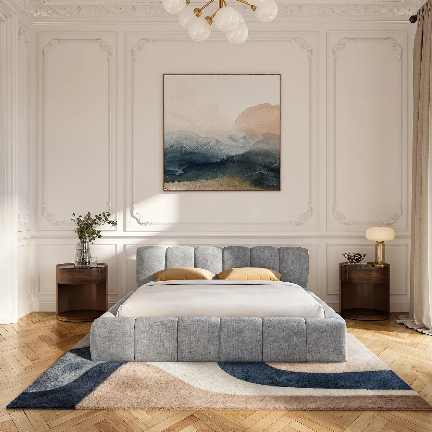 Véritable cocon, sa tête de lit garnie de mousse invite à s’y adosser pour profiter d’un moment de détente avant la nuit. Son revêtement en tissu chenille assure un toucher doux et délicat, sublimé d’une teinte gris galet intemporelle. L’effet monochrome se poursuit sur le cadre de lit, pour un ensemble contemporain assumé.