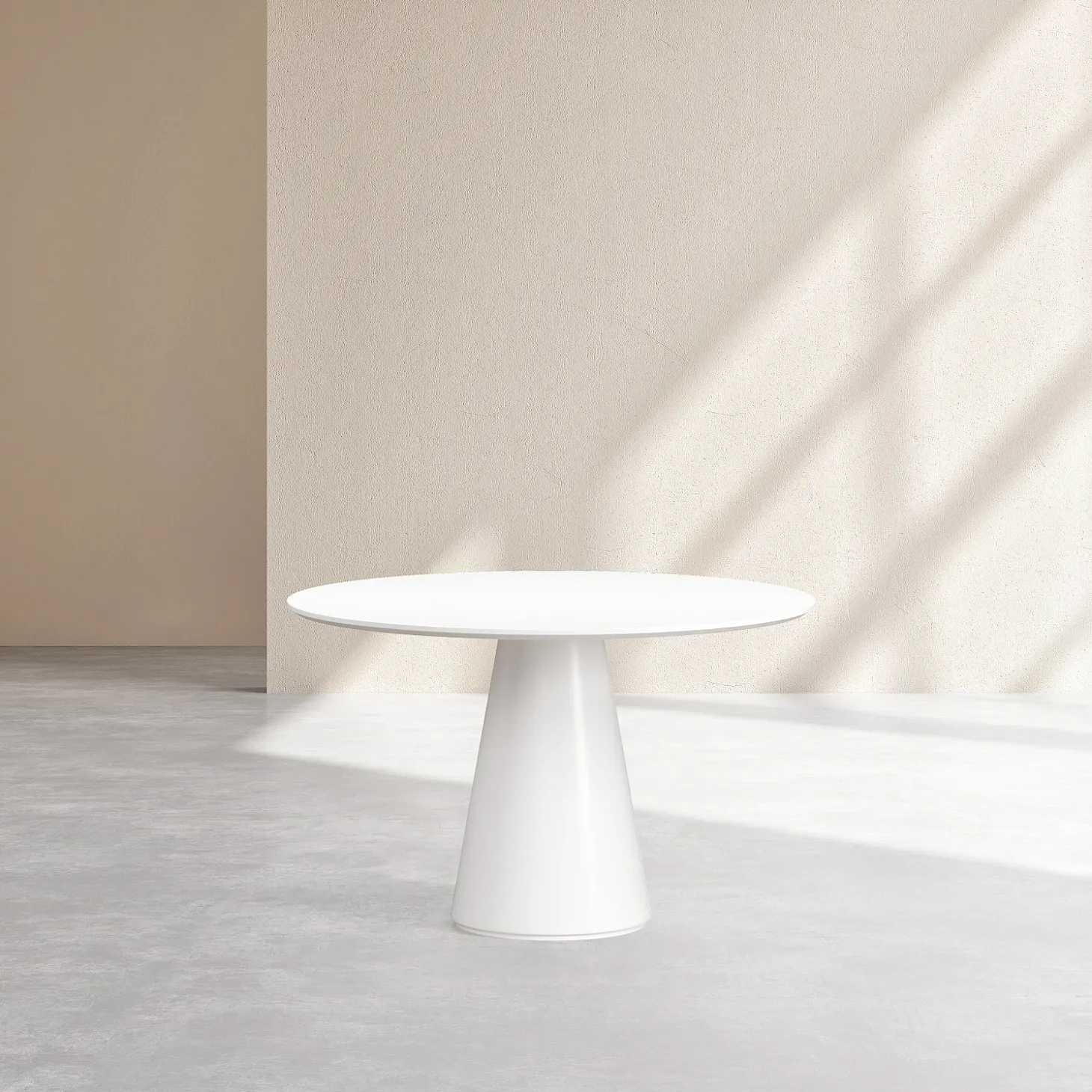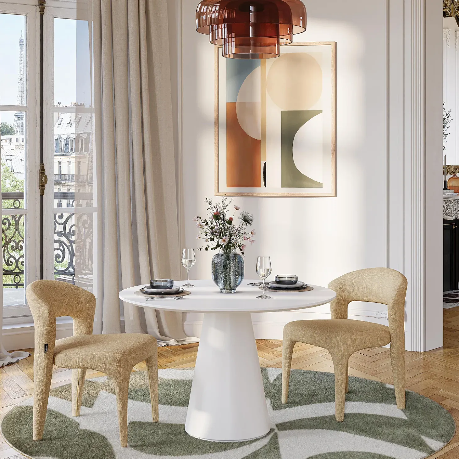 Son plateau rond repose sur un piètement conique central qui assure stabilité et confort, tout en libérant l’espace pour les jambes. L’équilibre visuel de sa silhouette lui permet de s’intégrer aussi bien dans une salle à manger épurée que dans un intérieur plus audacieux.