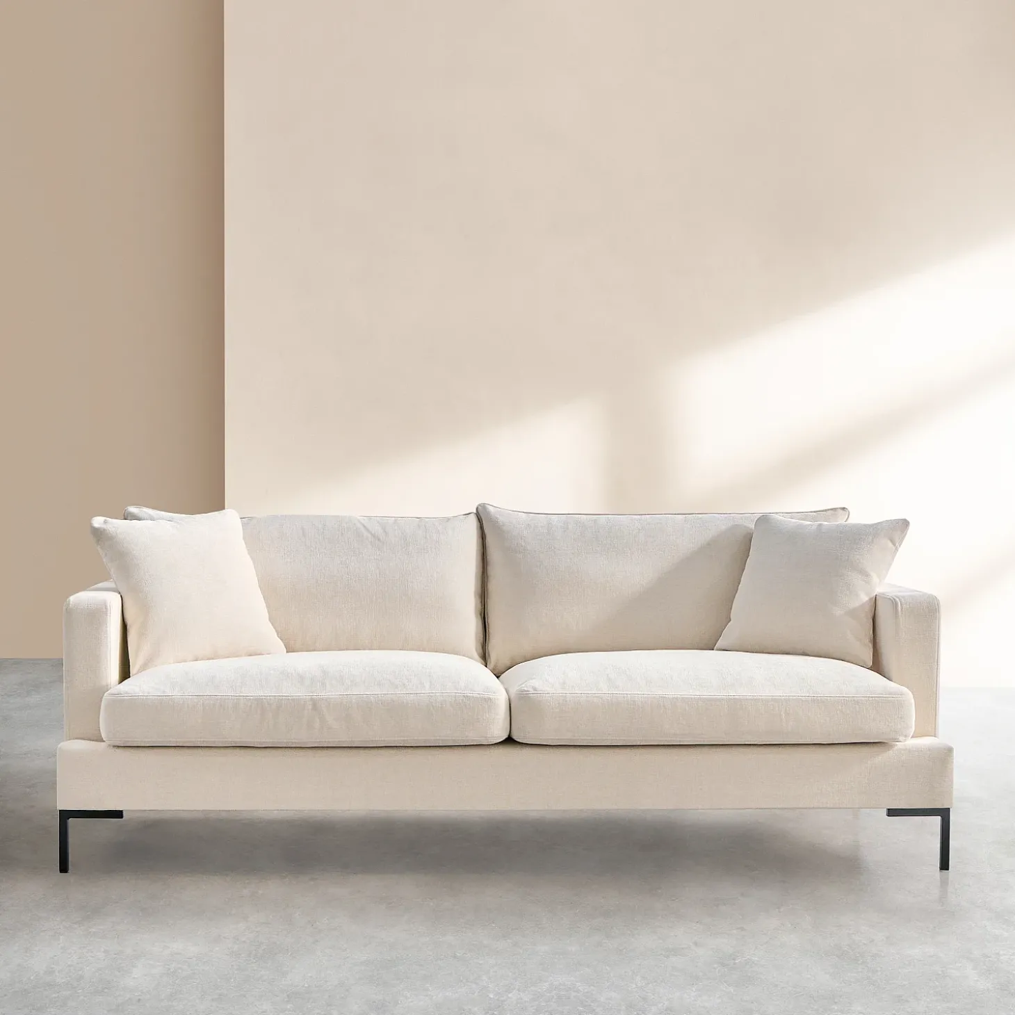 Sa structure fine repose sur un piétement en métal noir au design aérien. Ce contraste subtil entre la légèreté du piétement et le volume douillet de l’assise donne au canapé une silhouette sophistiquée, résolument moderne.