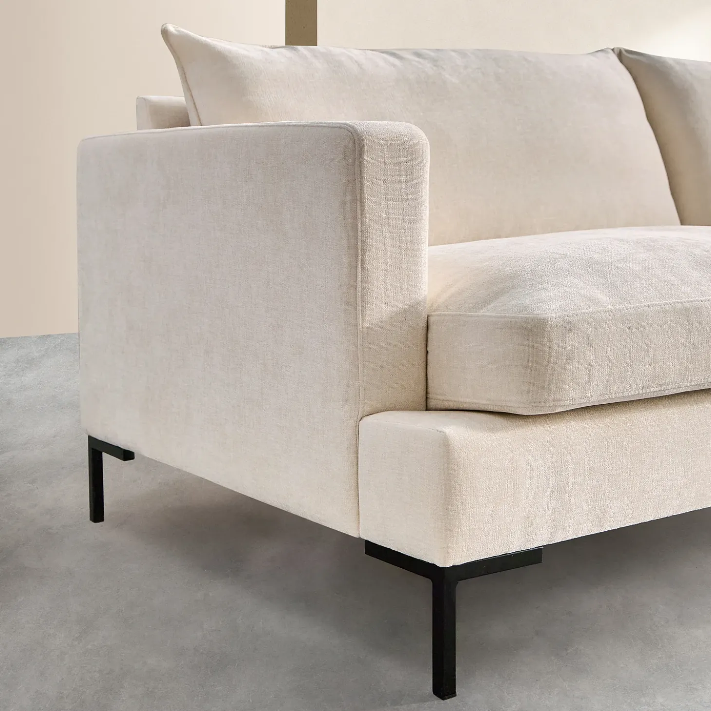 Sa structure fine repose sur un piétement en métal noir au design aérien. Ce contraste subtil entre la légèreté du piétement et le volume douillet de l’assise donne au canapé une silhouette sophistiquée, résolument moderne.