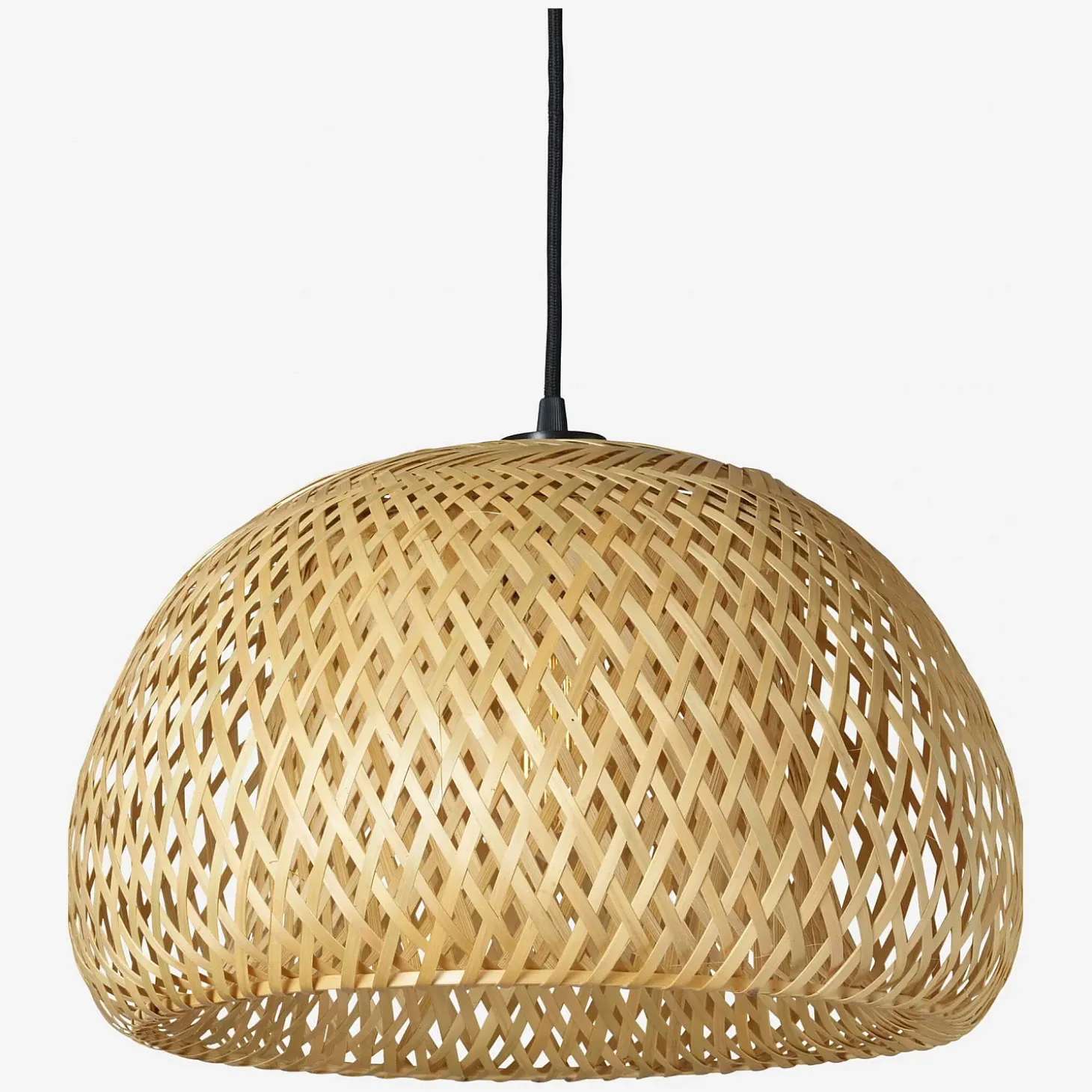 L’abat-jour pour suspension Sime en bambou mesure 40 cm de diamètre. Il se compose de deux cloches tressées à la main et imbriquées l’une dans l’autre pour un éclairage feutré et une ambiance chaleureuse.