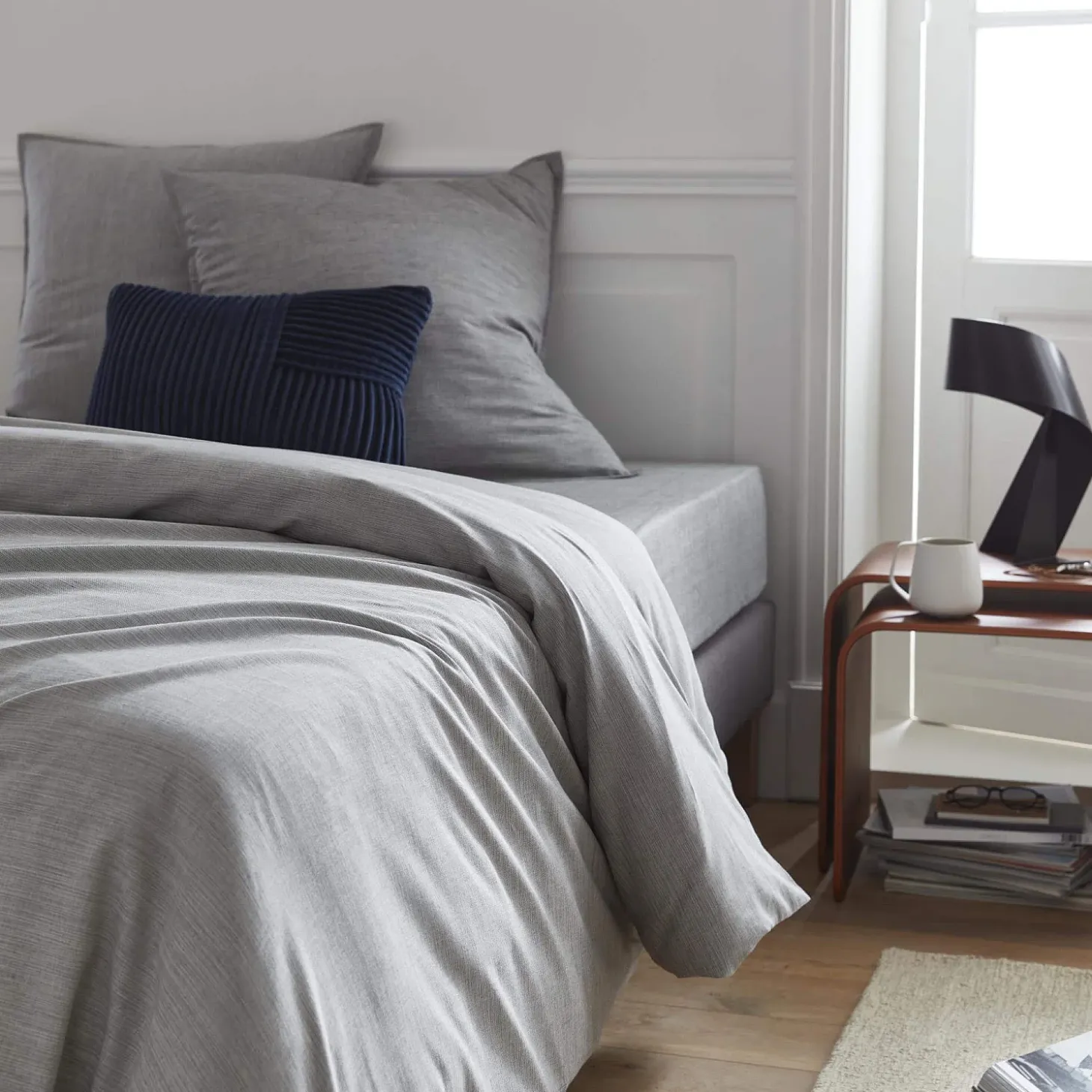 La housse de couette Skye en coton est compatible avec les couettes de 220 x 240 cm. De couleur gris, elle se compose de fils de différentes nuances et possède une finition boutons.