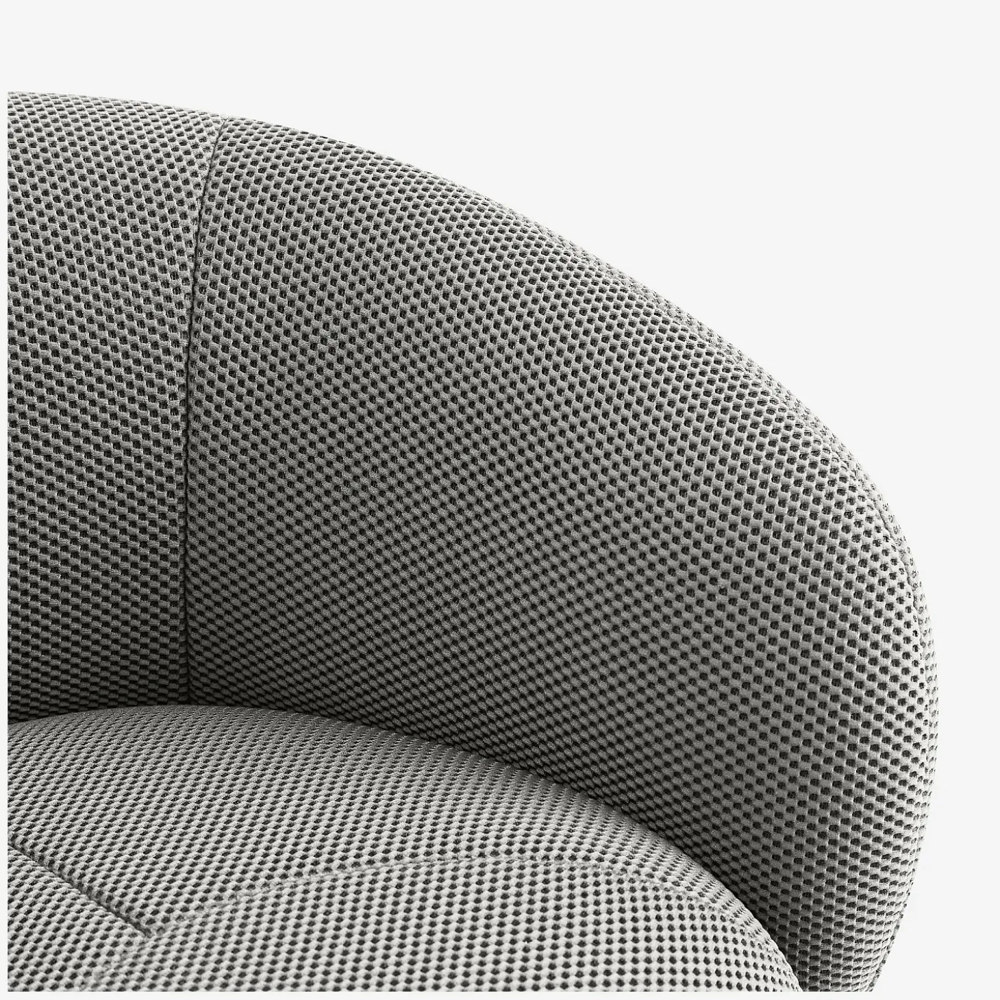 Le fauteuil pivotant Somio est revêtu d’un tissu 3D singulier. Alvéolé et unique en son genre, ce matériau combine design et technologie de pointe. Conçu pour être confortable, il est également léger, élastique et doté d’une résistance exceptionnelle aux altérations, garantissant une robustesse durable. Son maillage tridimensionnel lui confère des propriétés respirantes, assurant une perméabilité à l’air et une régulation thermique optimale, tout en apportant immédiatement du cachet à la pièce. Son relief captivant crée une atmosphère unique et design, mise en valeur par son coloris gris platine.