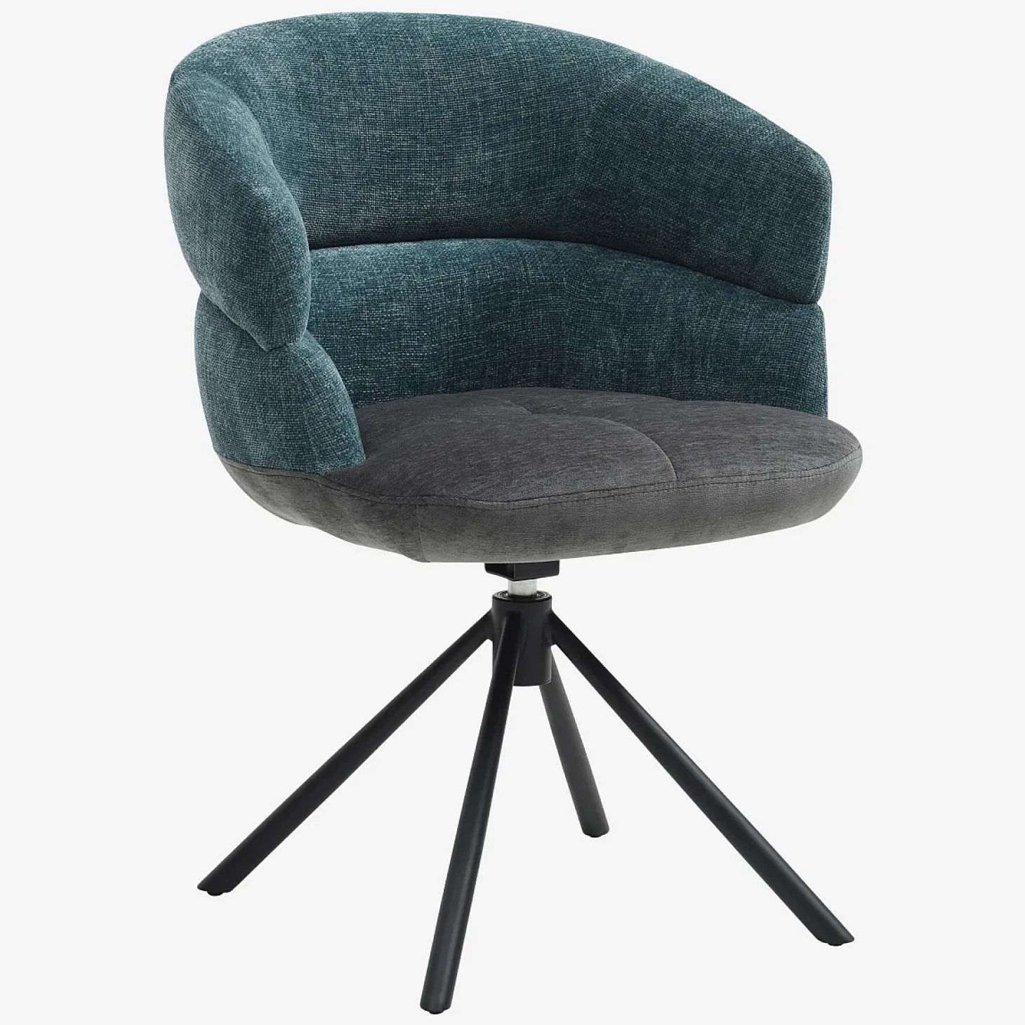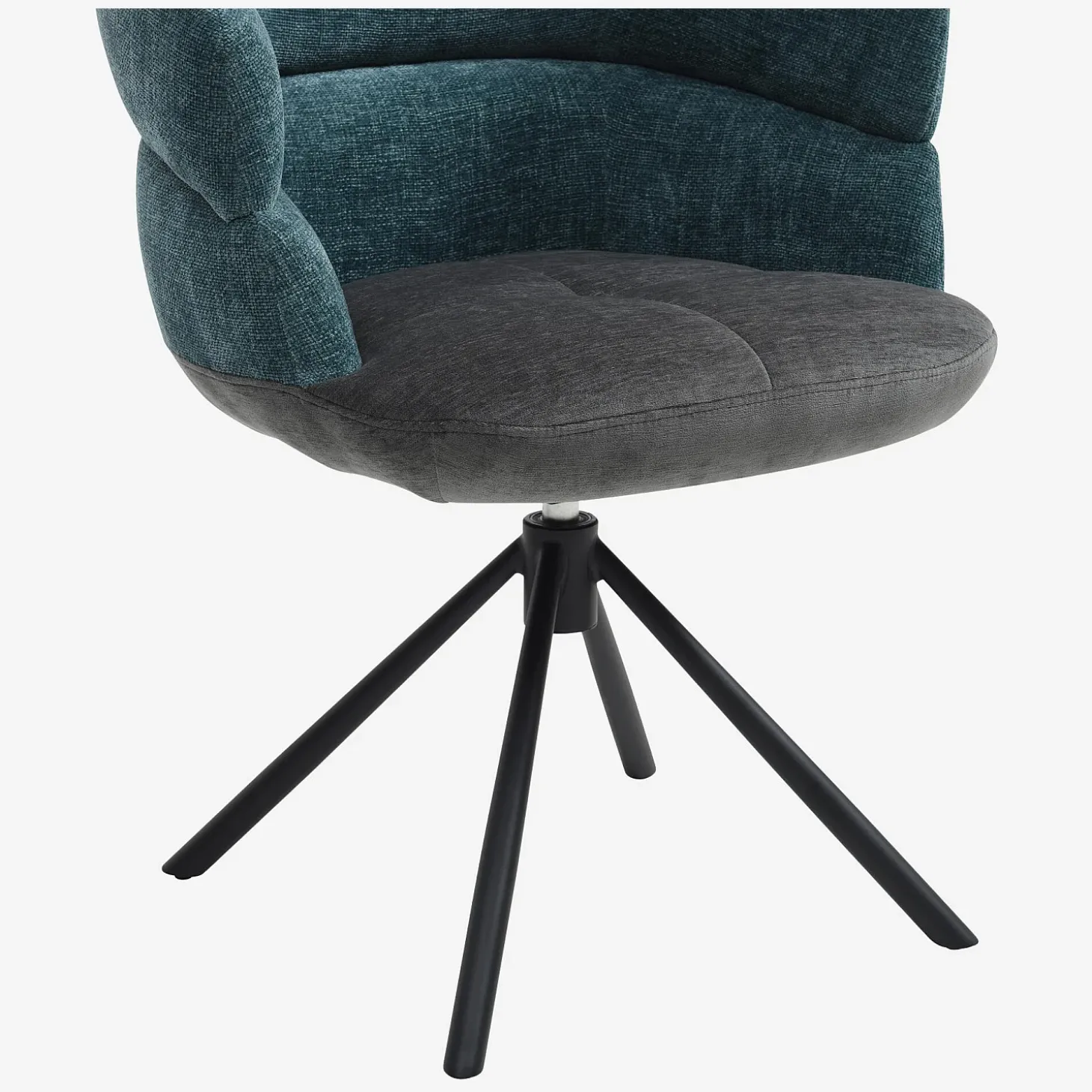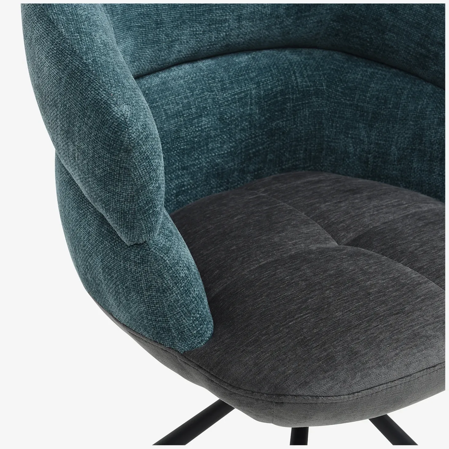 Son dossier enveloppe subtilement le dos, assurant ainsi un maintien optimal tout en créant une sensation de cocon délicat. Son assise en gris anthracite contraste élégamment avec le dossier en tissu chenille bleu canard, apportant une touche de couleur vibrante et tendance.