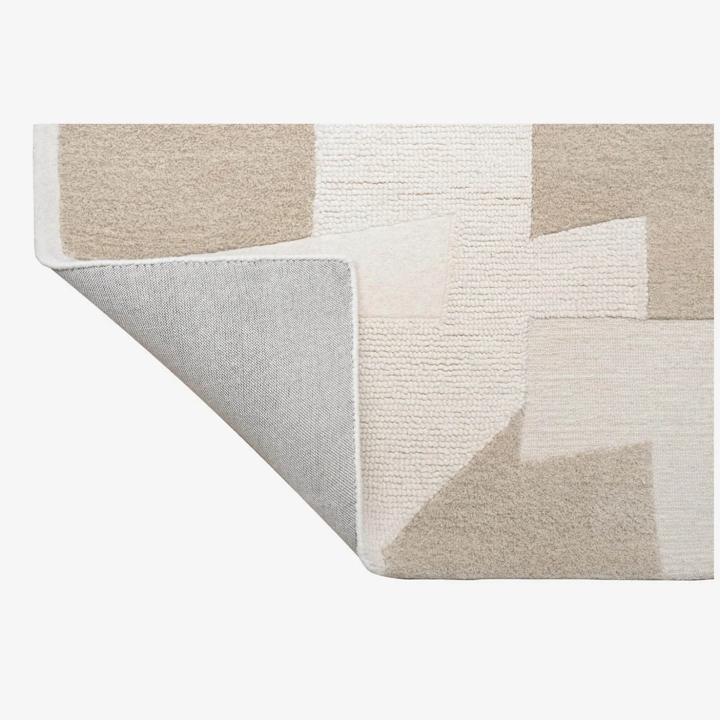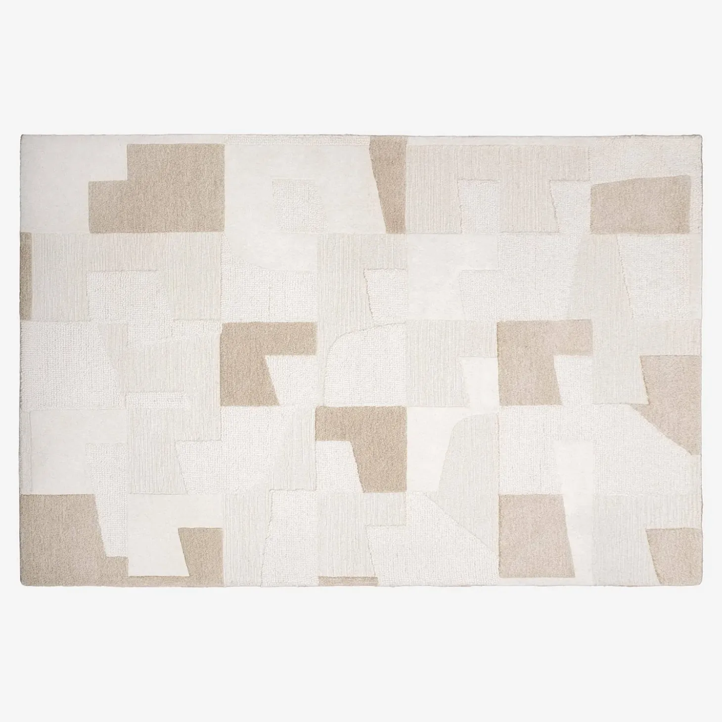 Tufté à la main, le tapis Tangram est en laine. Chaque fil a été piqué dans la toile puis coupé par un artisan tapissier. Les différentes formes colorées du motif créent un jeu de relief texturé.