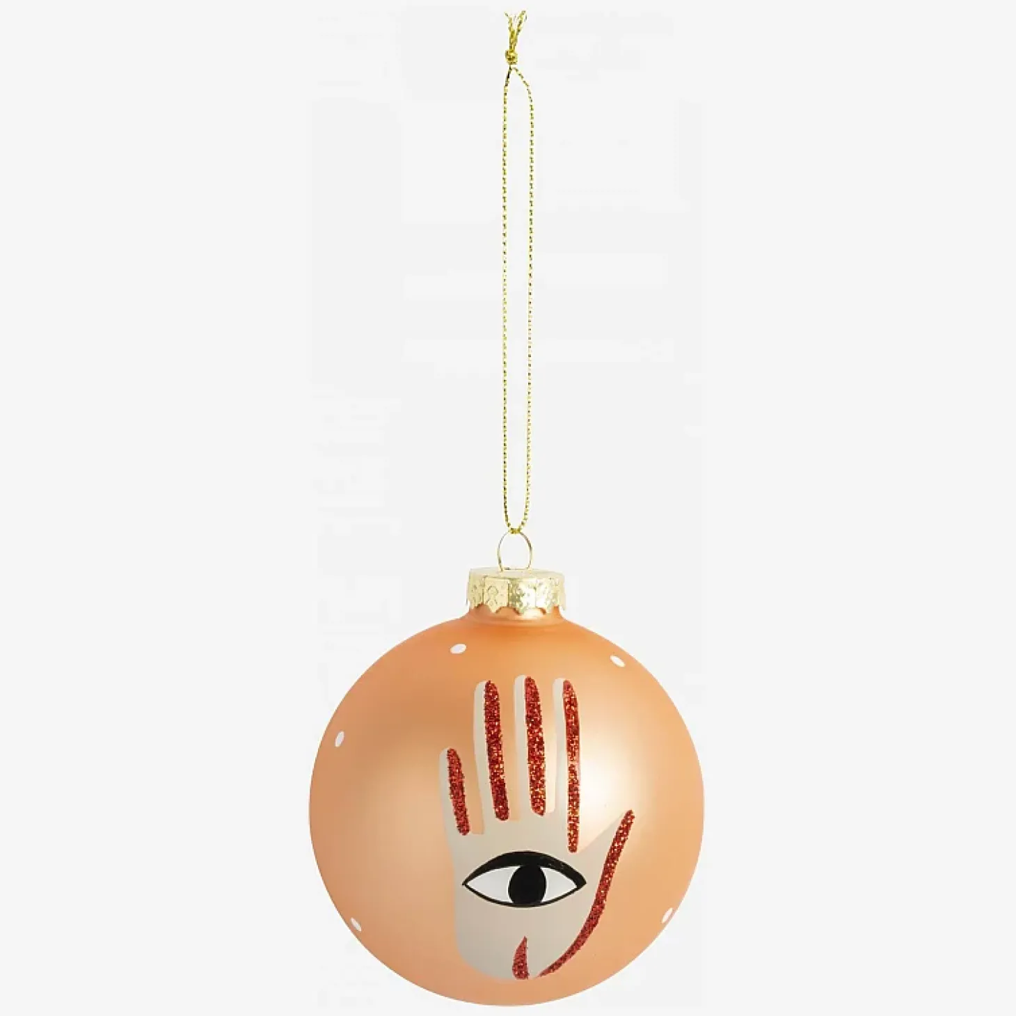 En verreTasha apporte une touche fantaisiste à vos fêtes avec ces boules de Noël en verre rose ornées d’un motif graphique.
