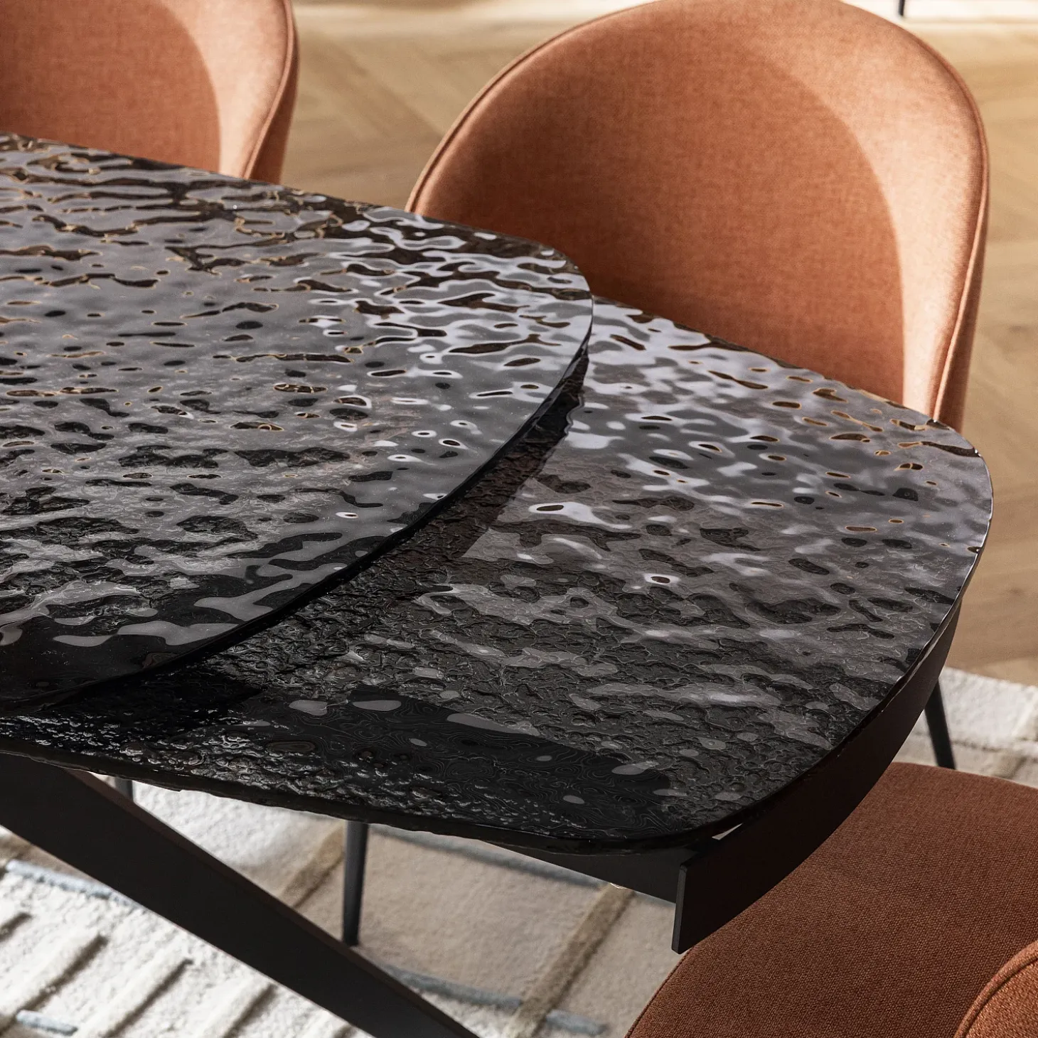 Son plateau, s’inscrivant dans la tendance actuelle du verre trempé bullé, joue subtilement avec la transparence et le relief du matériau, créant un rendu audacieux dynamisant la pièce. Ce design innovant est mis en valeur par un piètement en métal noir mat, apportant un contraste subtil.