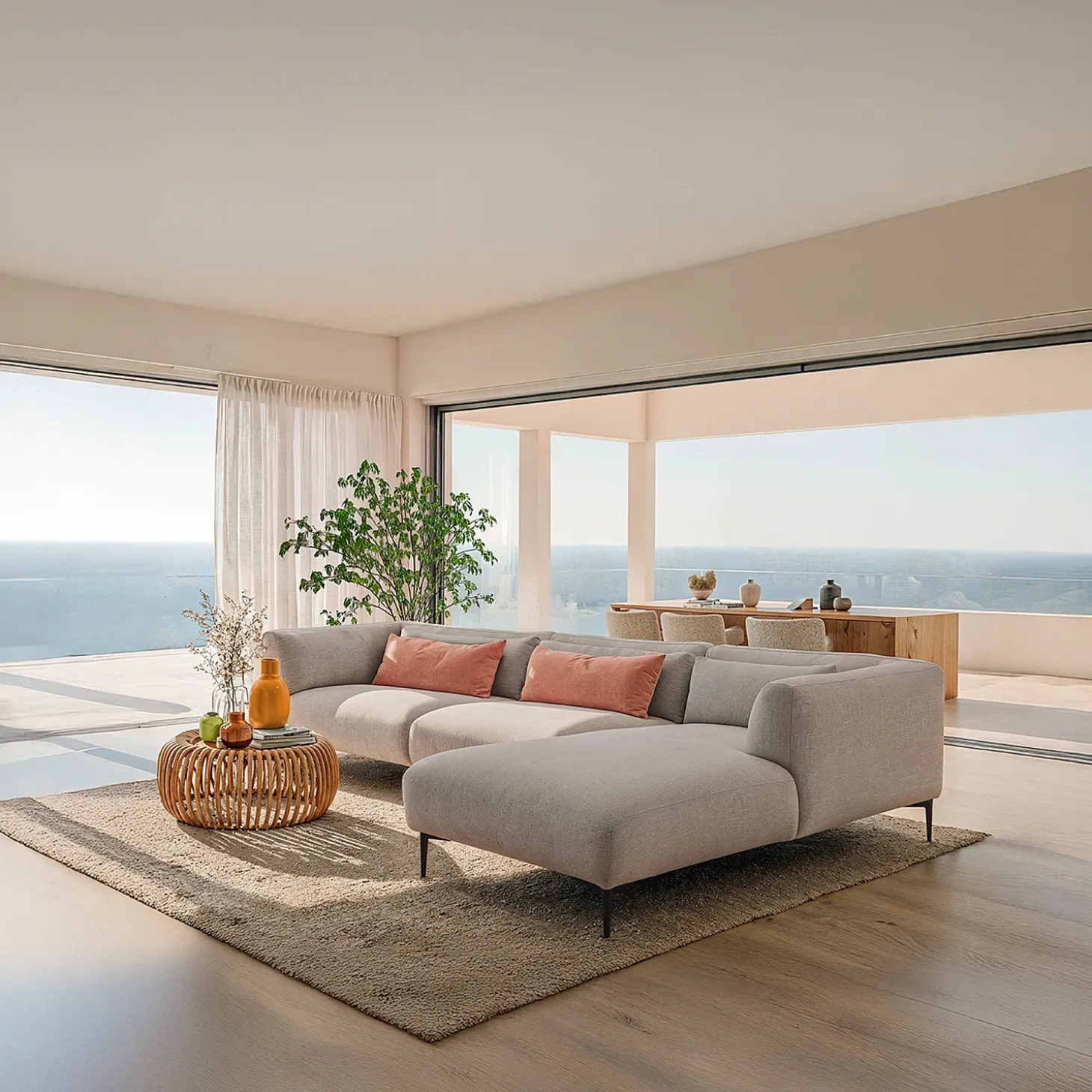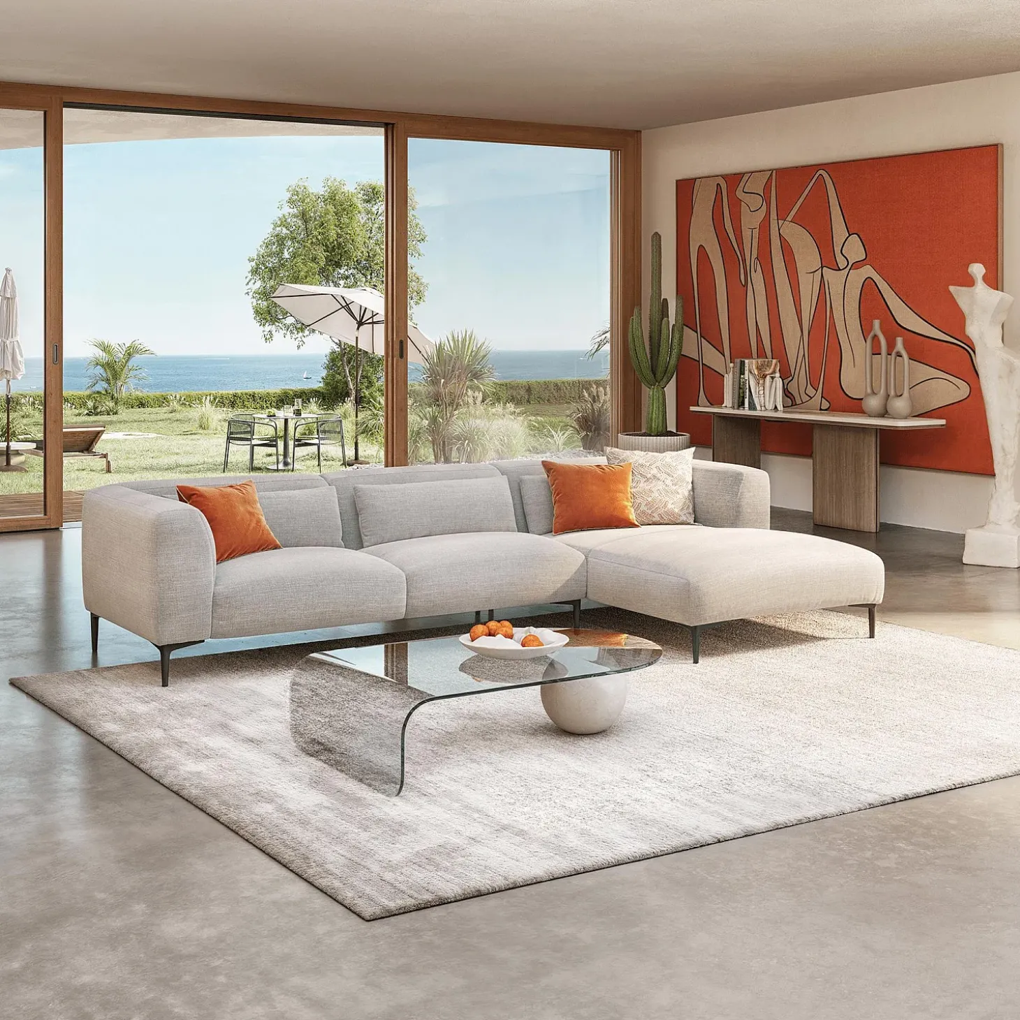 Sa méridienne spacieuse placée à droite est idéale pour des moments de détente prolongés.