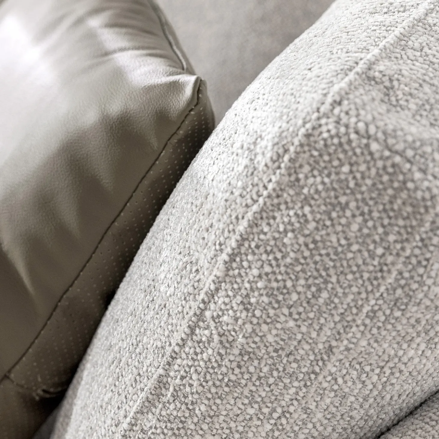 Les coussins en tissu et en cuir ainsi que les pieds fins en métal noir finissent de parfaire cette allure moderne et sophistiquée.