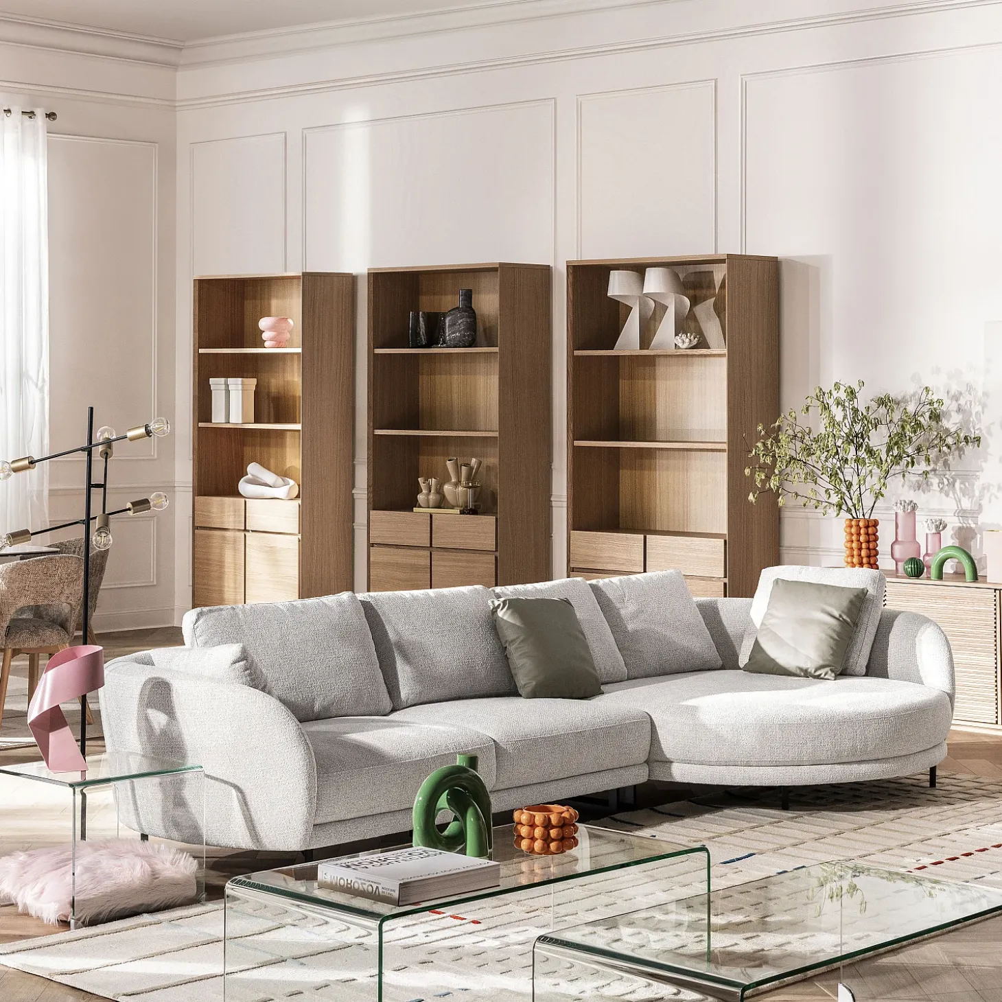 Le canapé d’angle droit 4 places Velia est l’allié pratique des salons contemporains et chaleureux.