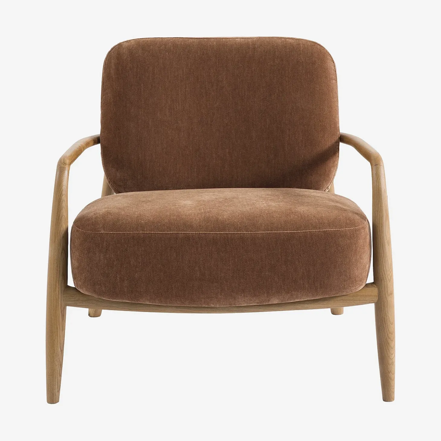 Le tissu marron cuivré, choisi pour sa tonalité apaisante et chaleureuse, enveloppe le fauteuil d’une douceur visuelle propice aux instants de calme. Son assise accueillante et son dossier confortable offrent une sensation feutrée qui fait de Velika une pièce aussi rassurante que raffinée.