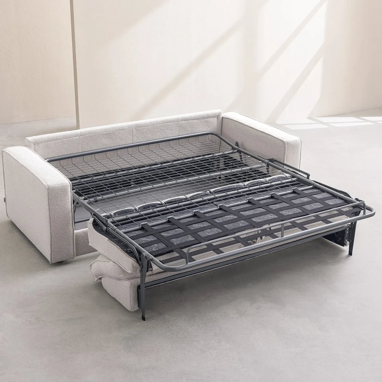 Le canapé convertible 2 places Vienne est habillé d’un tissu Tolfa en bouclette courte à l’aspect texturé et au toucher doux, décliné dans une teinte crème lumineuse.