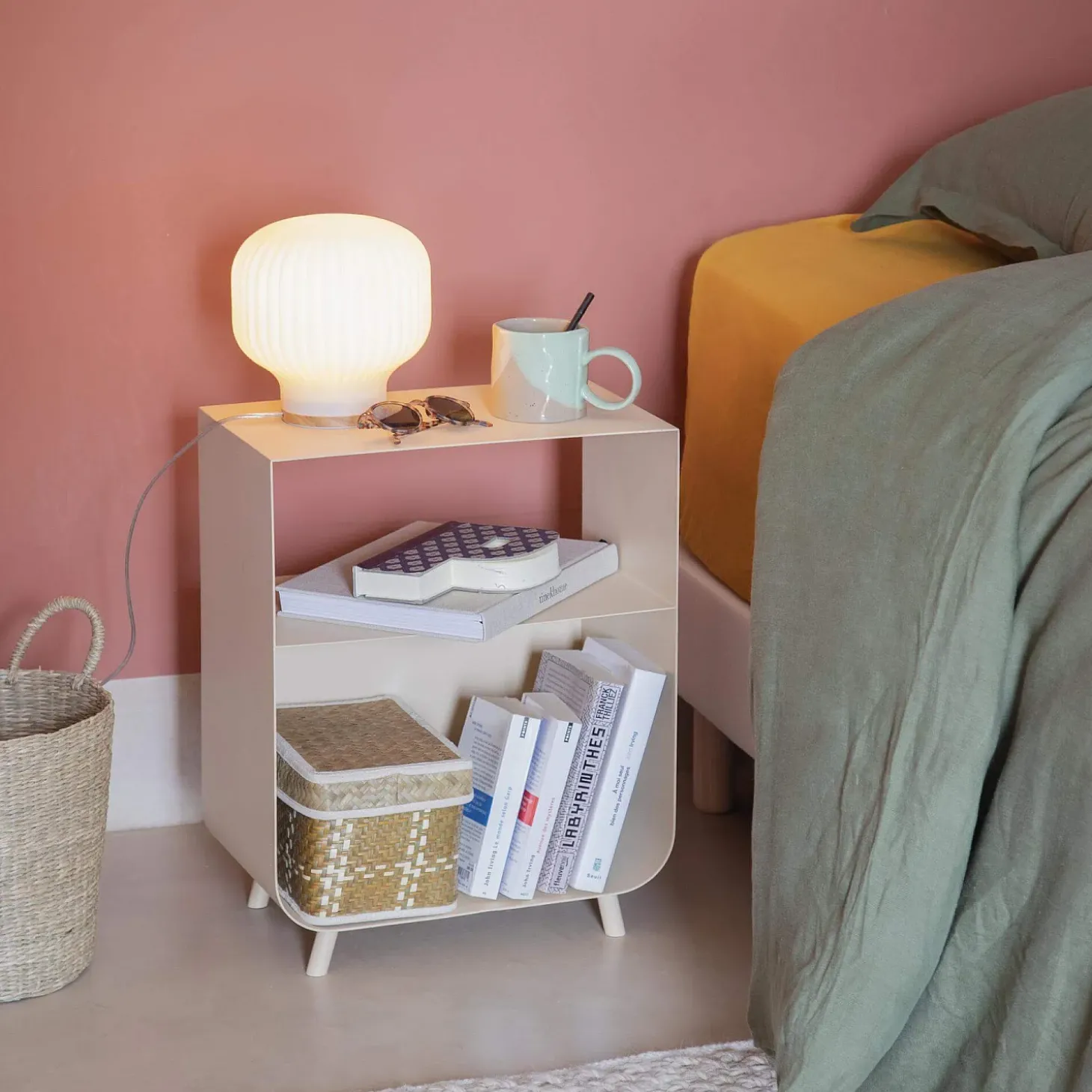 La table de chevet Viktor se compose d’une structure faite à partir d’une seule feuille de métal pliée et d’une étagère. Cette table de nuit possède également 4 pieds évasés.