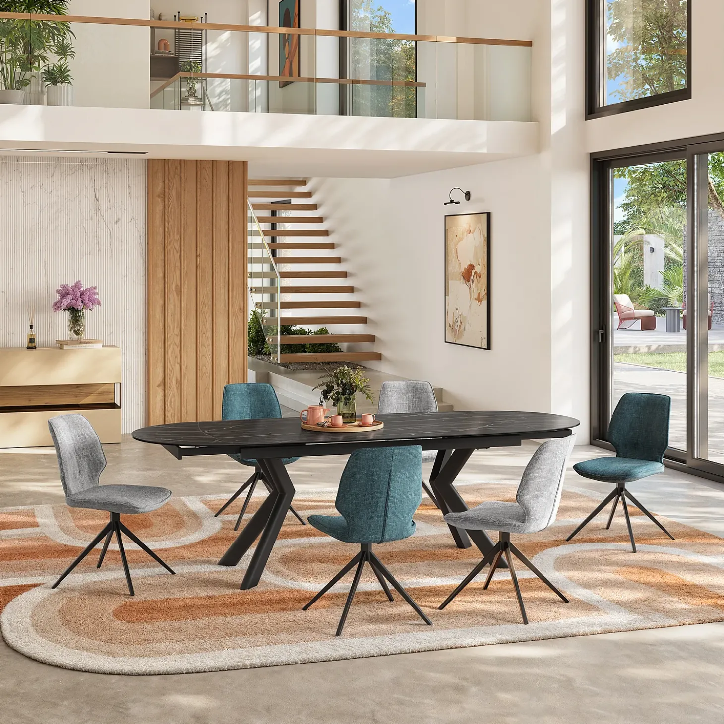 Charge maximale supportée : 120 kgCe lot de 2 chaises pivotantes marie lignes graphiques, confort et tissu chenille vibrant. Vince dynamise la salle à manger avec une élégance contemporaine et un mouvement maîtrisé.